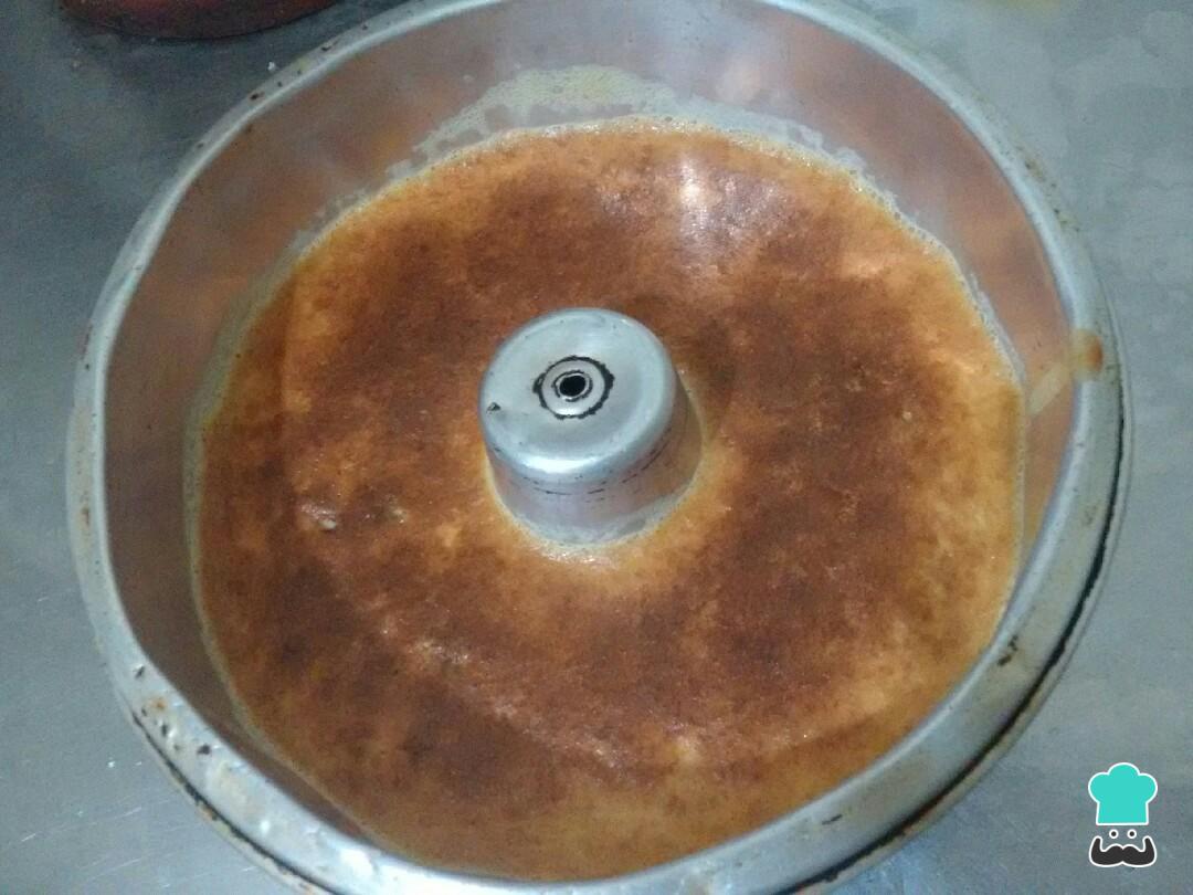 Espalhe o caramelo no fundo de uma forma e de pudim, acrescente a mistura do liquidificador e leve ao forno alto em banho-maria por 45 minutos, ou até o palito sair limpo.