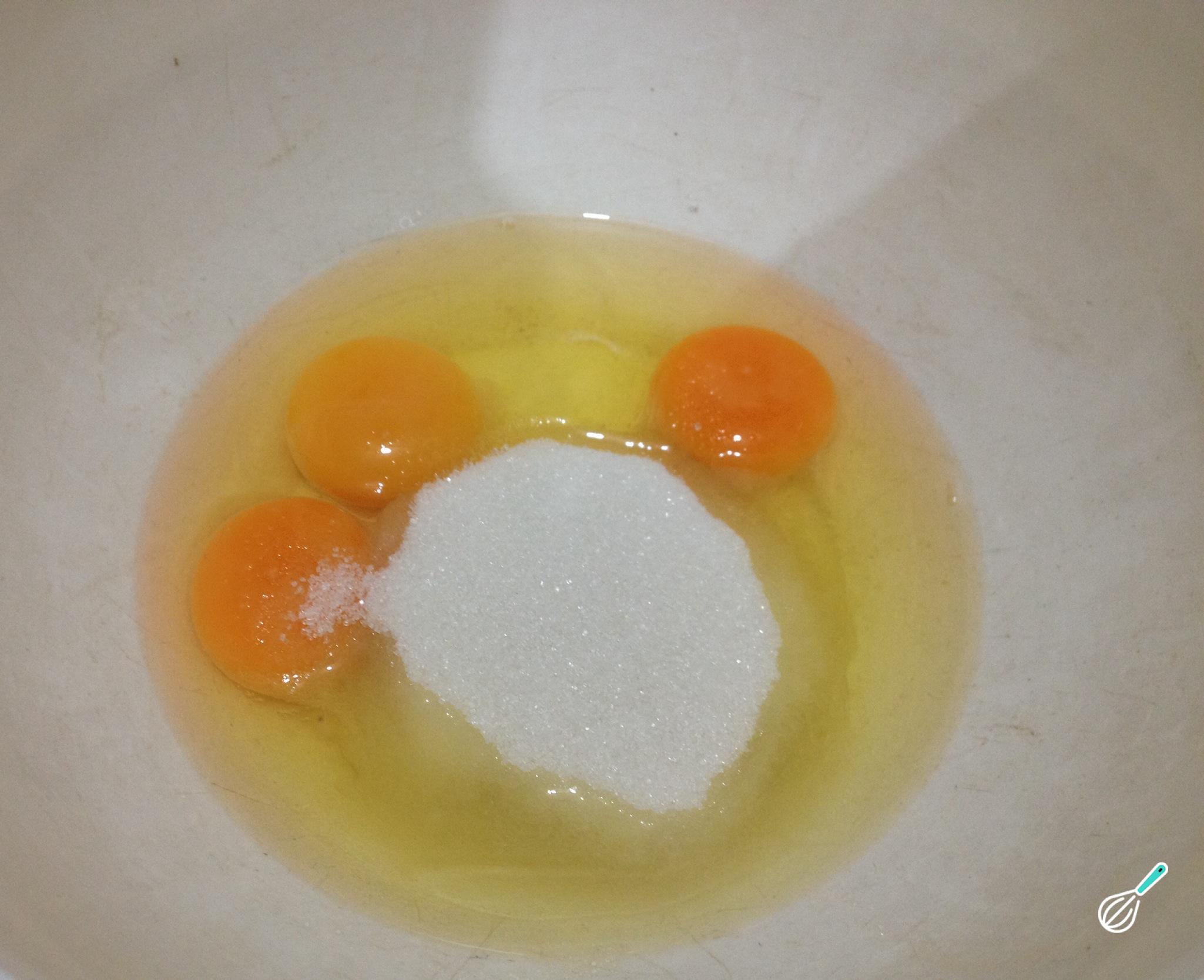 Em uma tigela bata os ovos com o açúcar, até dissolver o açúcar.