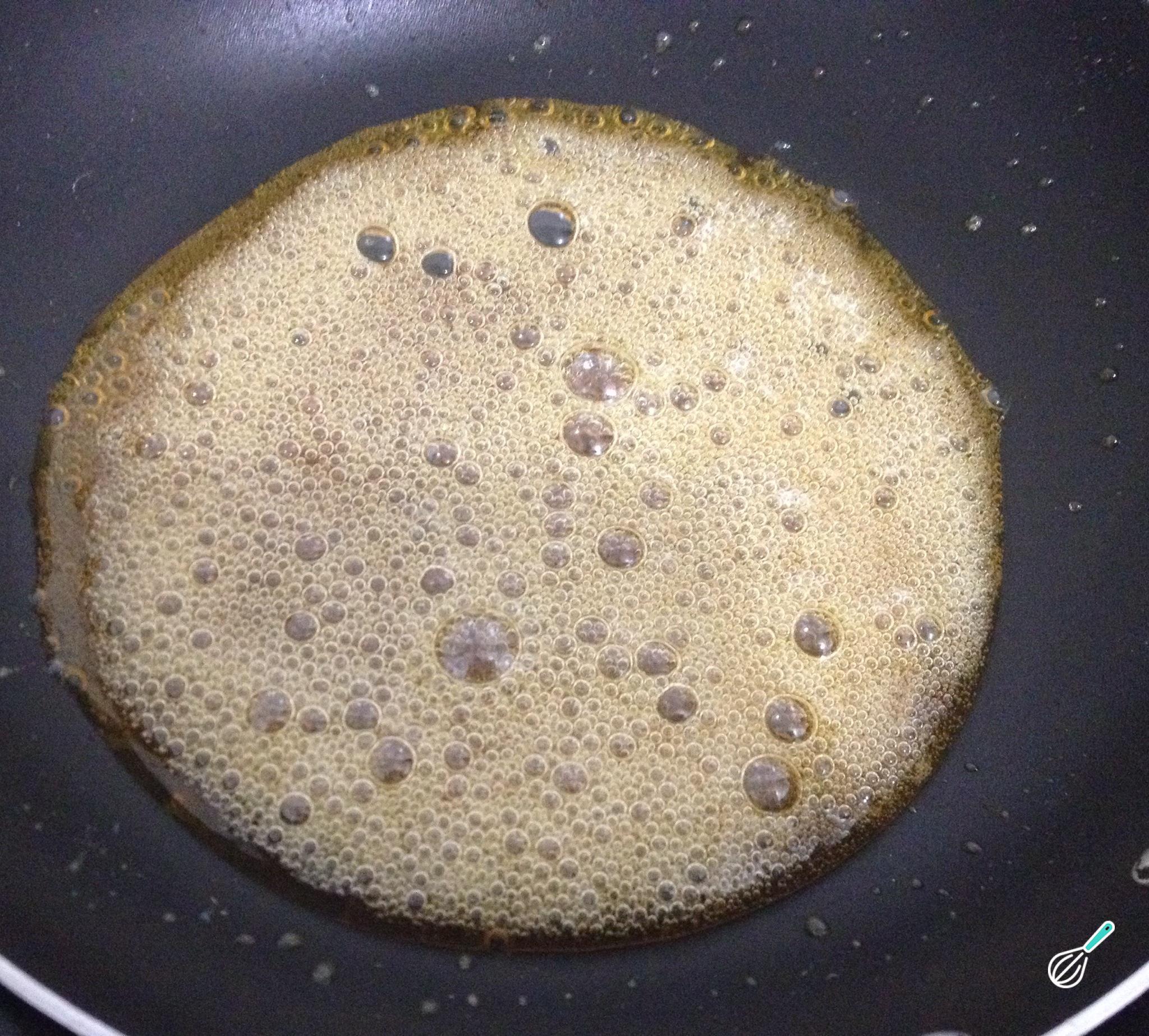 Para o caramelo, em uma frigideira adicione o açúcar com uma colher de sopa de água. Quando ganhar a tonalidade de caramelo baixe o fogo.