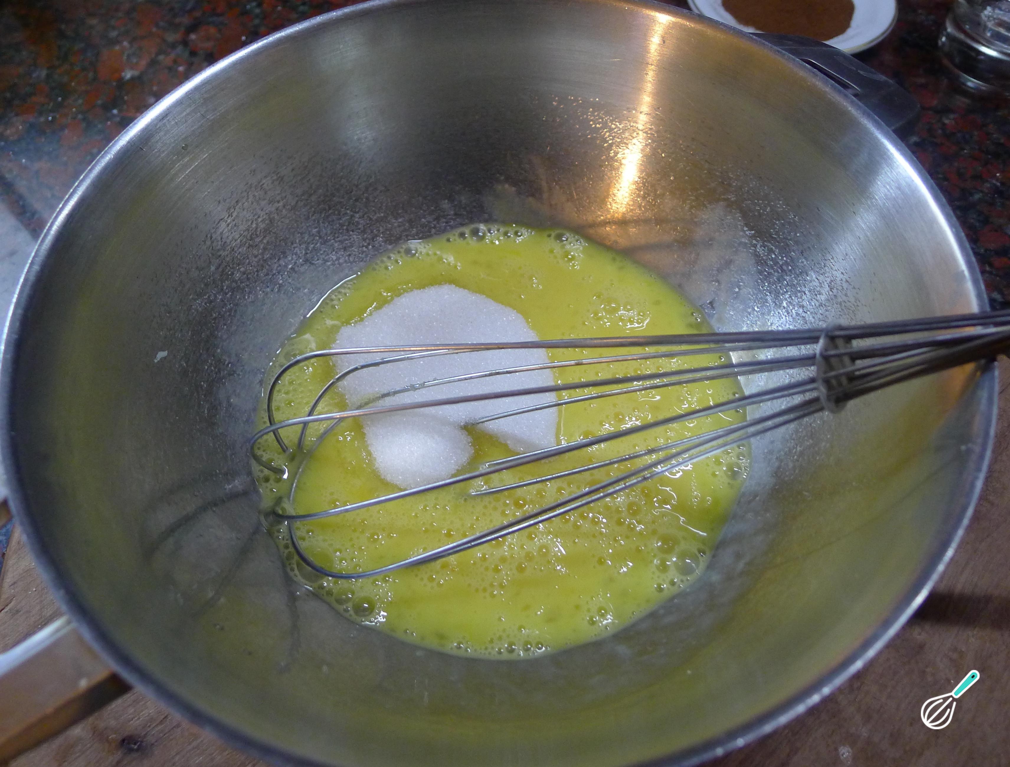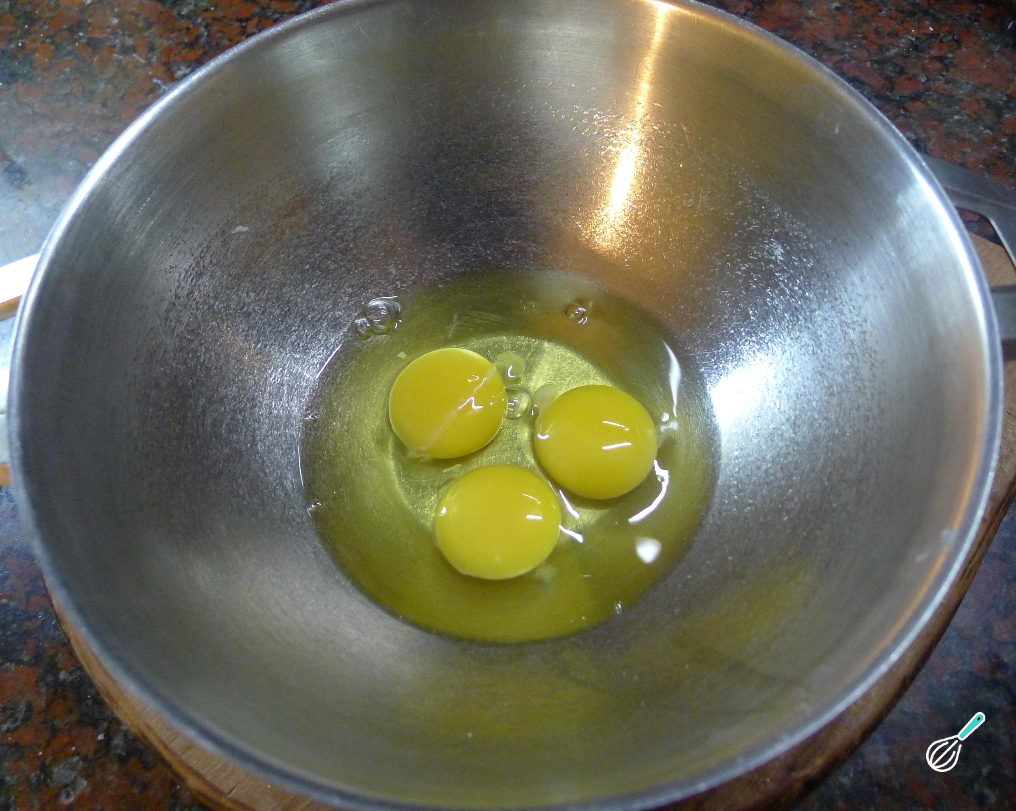 Em uma tigela coloque os ovos e bata com um batedor de mão, ou batedeira elétrica.