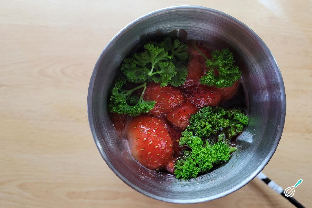 Transfira para um mixer ou liquidificador junto com as folhas de salsinha e bata até ter uma calda.