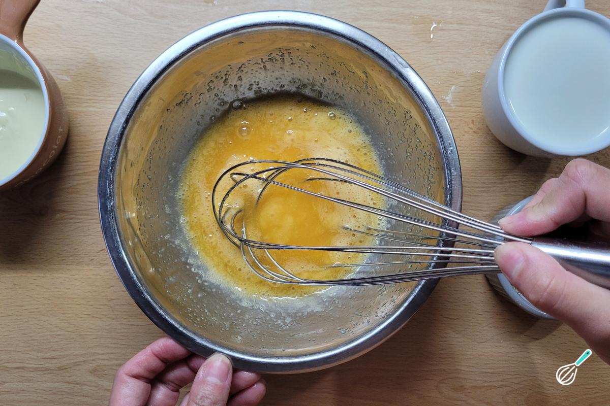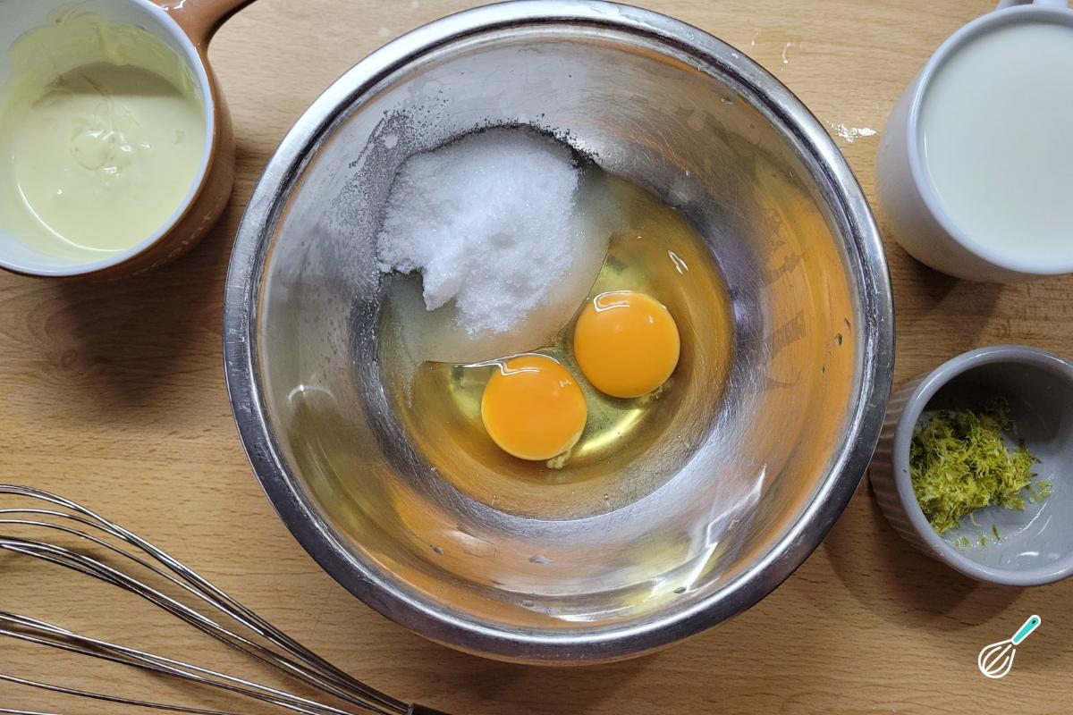 O chocolate branco derrete mais rápido do que o chocolate preto, então tome cuidado para não queimar. Reserve o chocolate derretido e deixe esfriar um pouco para que ele não vá muito quente em contato com os ovos. Enquanto isso, em uma tigela grande, coloque o açúcar com os ovos.