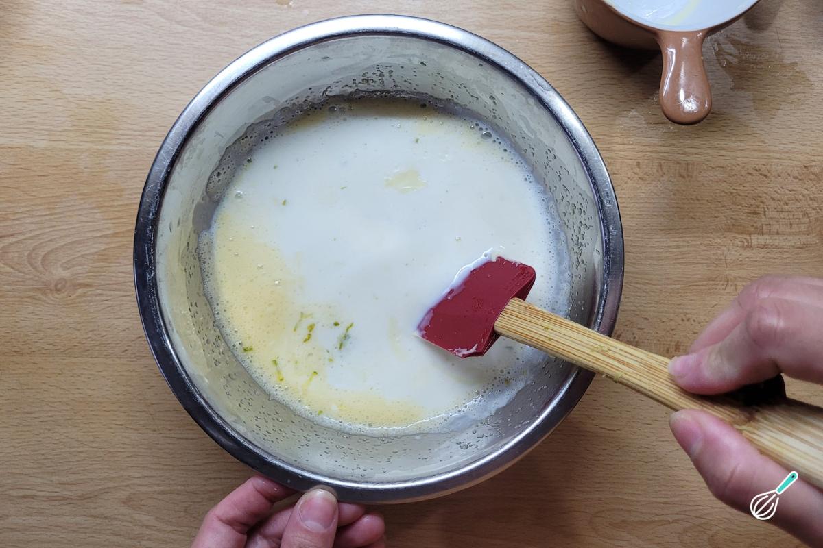 Adicione as raspas de limão, o leite e o chocolate branco derretido.