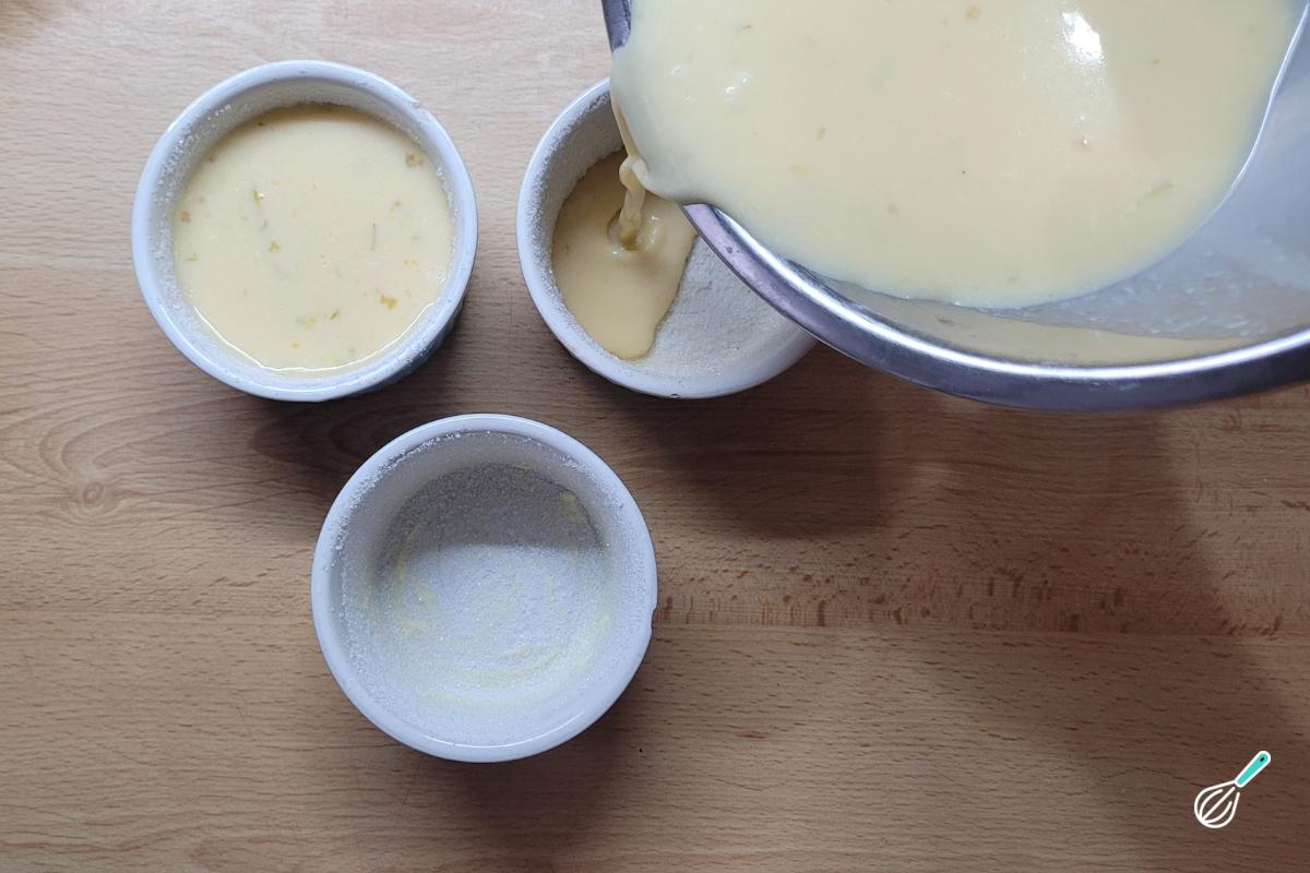 Verta as misturas na forma untada e polvilhada com farinha. Aqui fiz em porções individuais, mas você pode adaptar essa receita para fazer em uma forma maior de pudim com furo no meio.