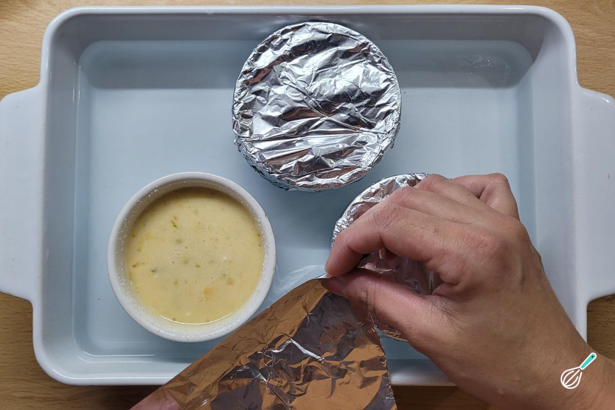 O papel alumínio evita que o vapor gerado pelo banho maria no forno condense sobre a massa. Alternativamente, você pode assar o pudim na air fryer. Nesse caso, não precisa de banho maria. Apenas coloque as forminhas cobertas com papel alumínio na airfryer a 170oC também por uns 40 minutos.