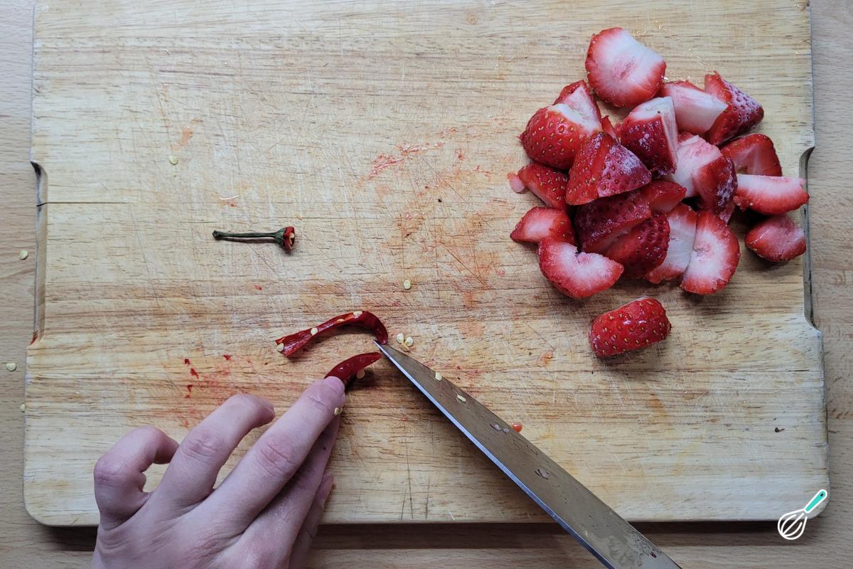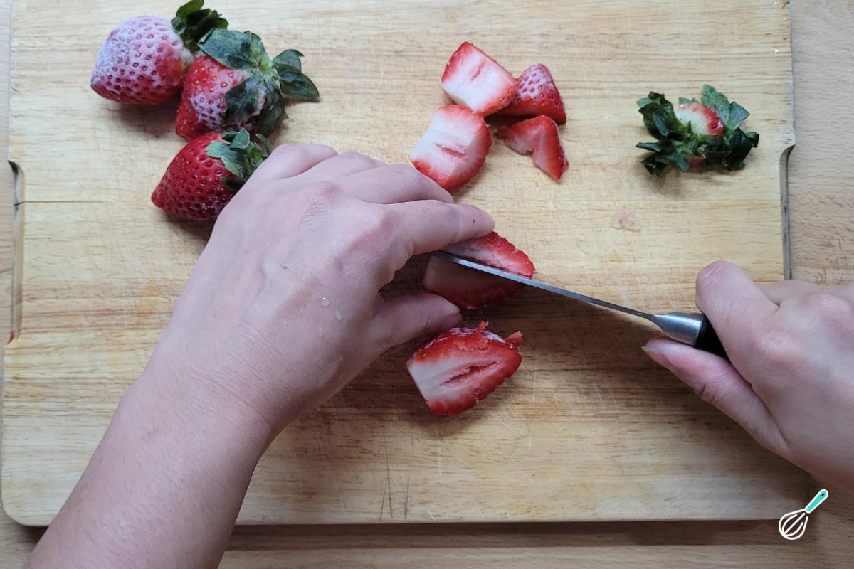 Enquanto o pudim assada, vamos fazer a calda. Retire os cabinhos e corte os morangos em pedaços menores. Se estiver usando morangos congelados, tome muito cuidado para não se cortar.
