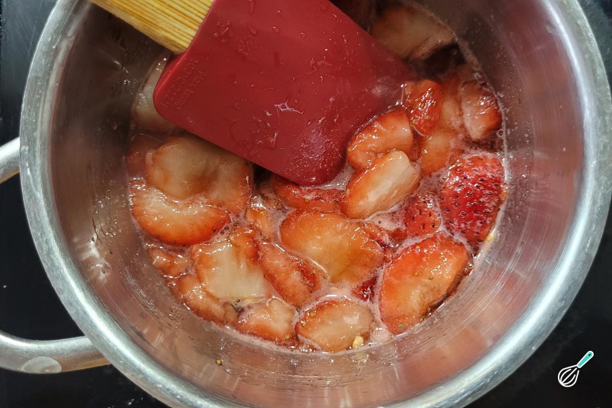Deixe em fogo médio por uns 5-10 minutos mexendo de vez em quando até ver que os morangos estão quase desmanchados.