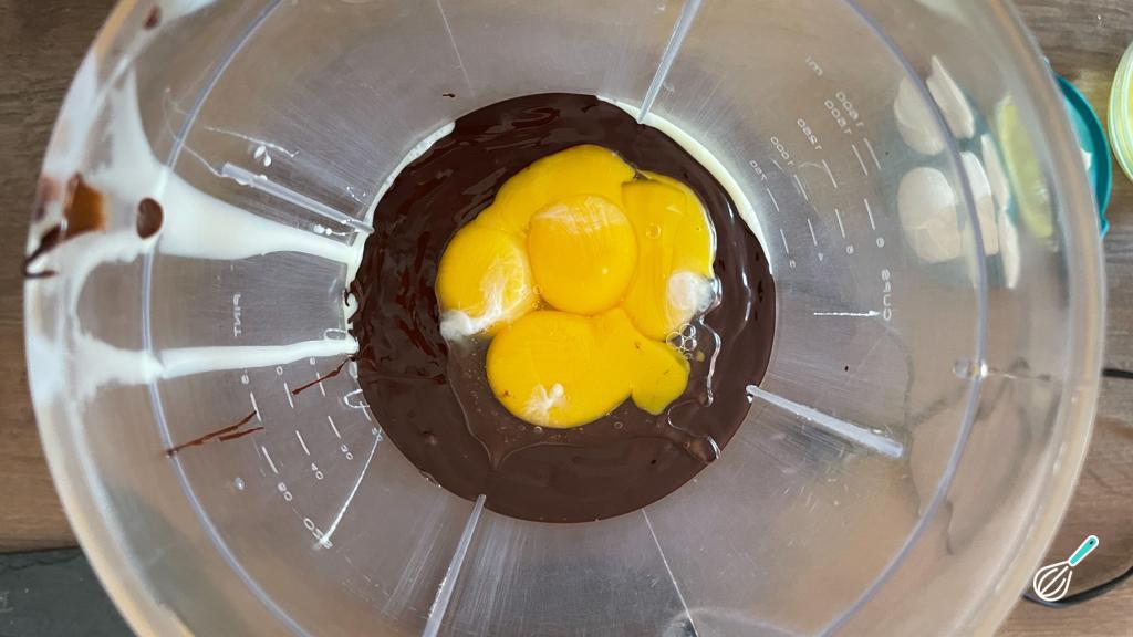No liquidificador, coloque o chocolate derretido, o leite condensado e as gemas, batendo até ficar uma mistura homogênea.