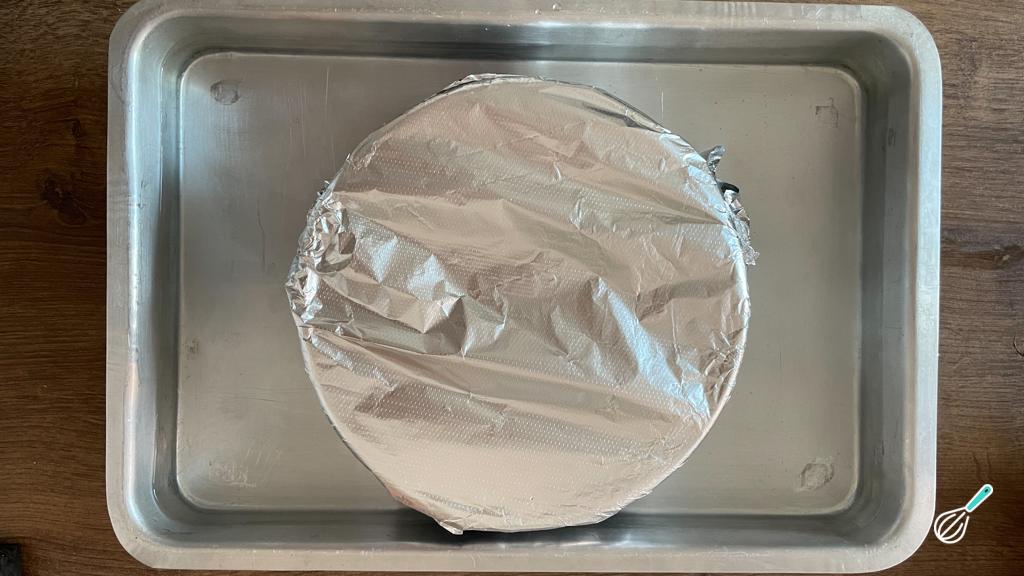 Coloque a forma de pudim numa assadeira maior, cubra com papel alumínio e coloque água quente na forma até a metade da forma de pudim. Leve ao forno preaquecido a 180 graus por 30 minutos ou até ficar firme no centro – o palito ainda sairá sujo. Deixe na geladeira por 12 horas antes de desenformar.