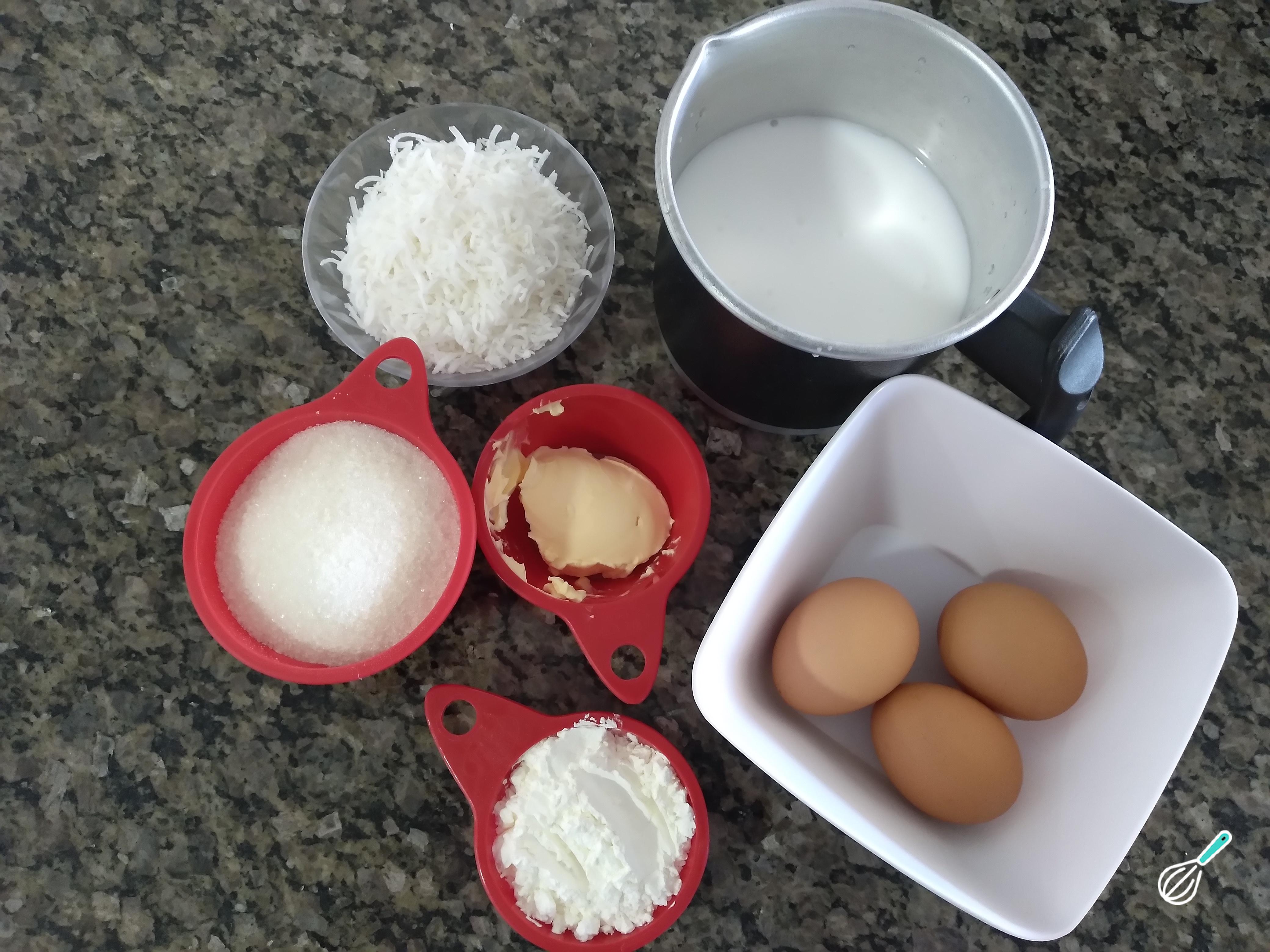 Separe os ingredientes para fazer o pudim: Ovos, manteiga, coco, leite de coco, açúcar, amido e a essência de baunilha.