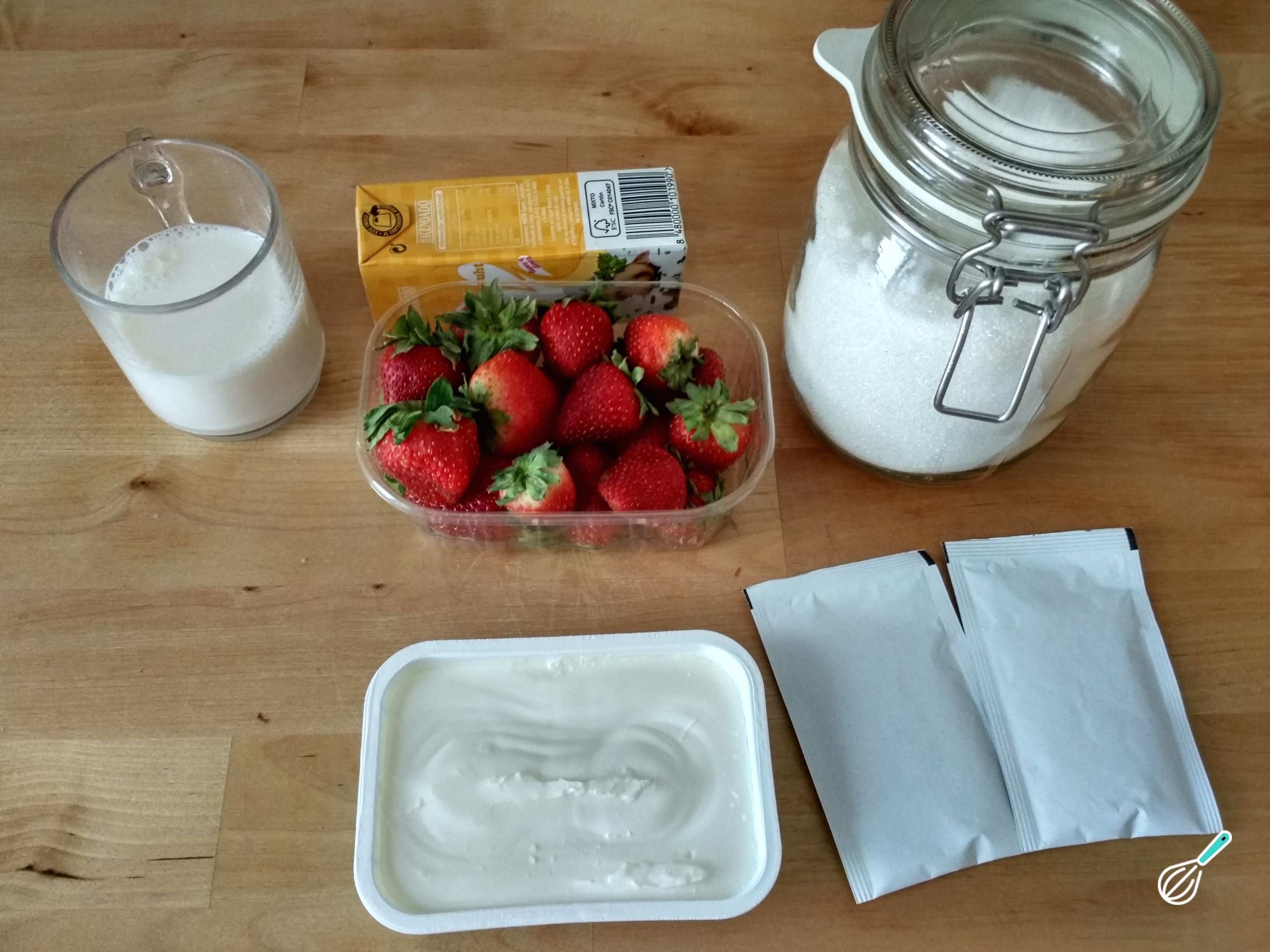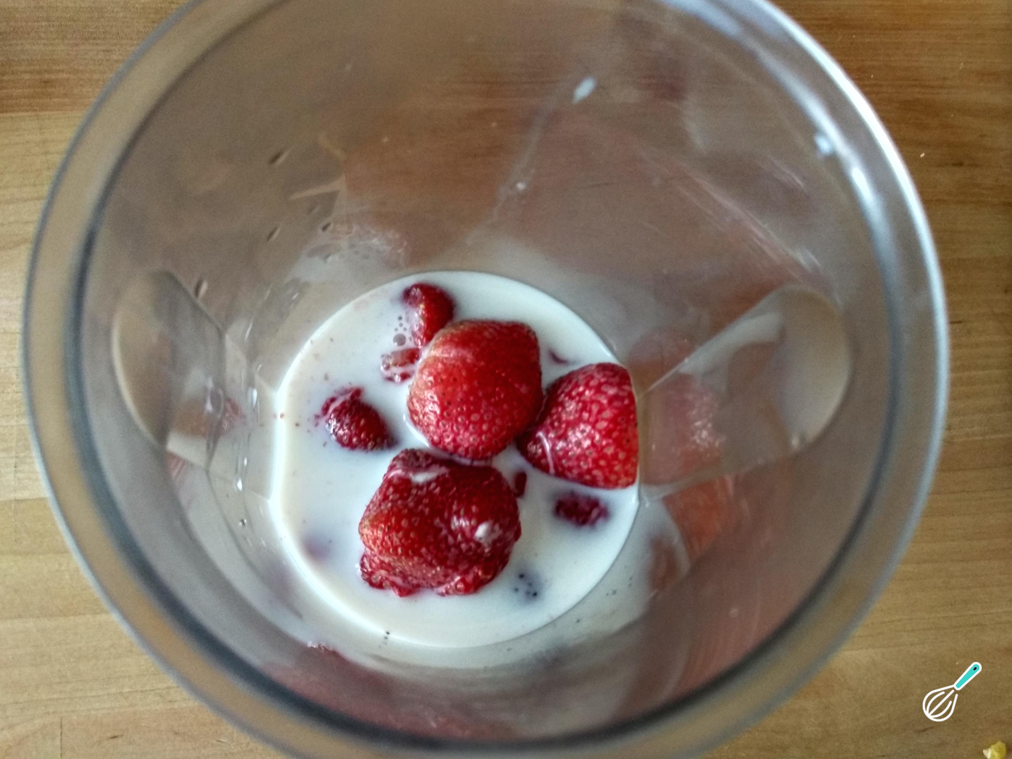 Enquanto isso, prepare a camada de morango: misture o creme de leite com metade do leite e com os morangos previamente lavados. Bata bem e adicione o açúcar e a coalhada em pó. Continue batendo até que não restem grumos.