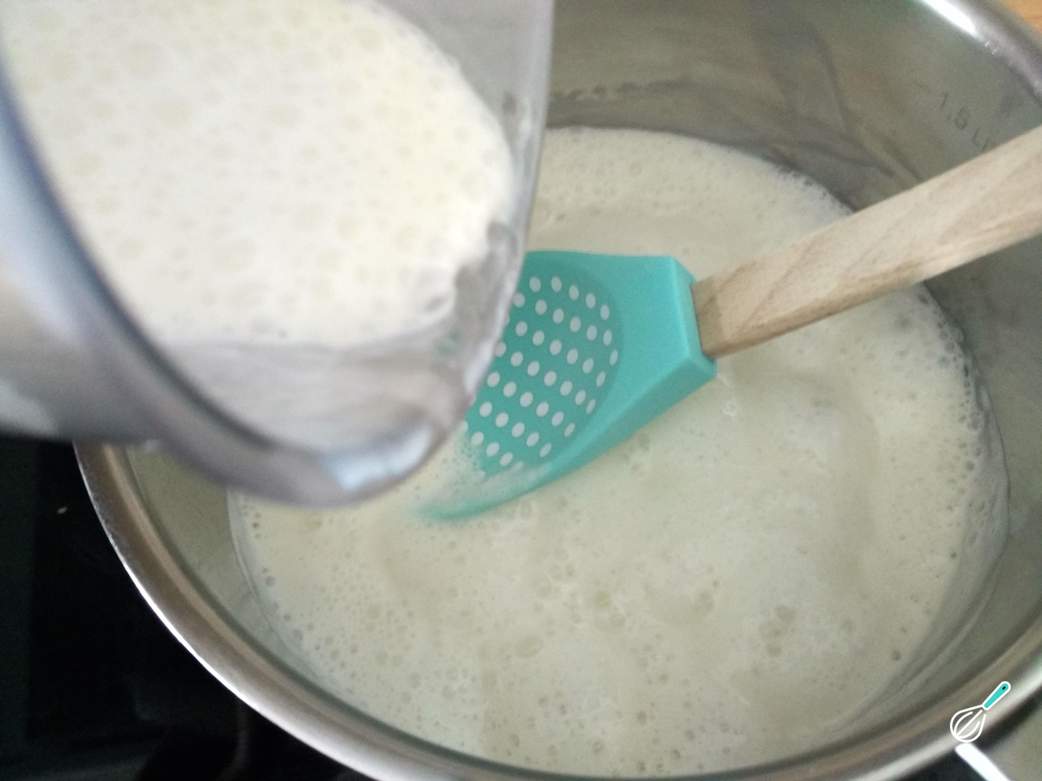 Aqueça o leite restante em uma panela e adicione o líquido que bateu no liquidificador. Misture constantemente até ferver, retire do fogo por alguns segundos e volte a colocá-lo no fogo até ferver.