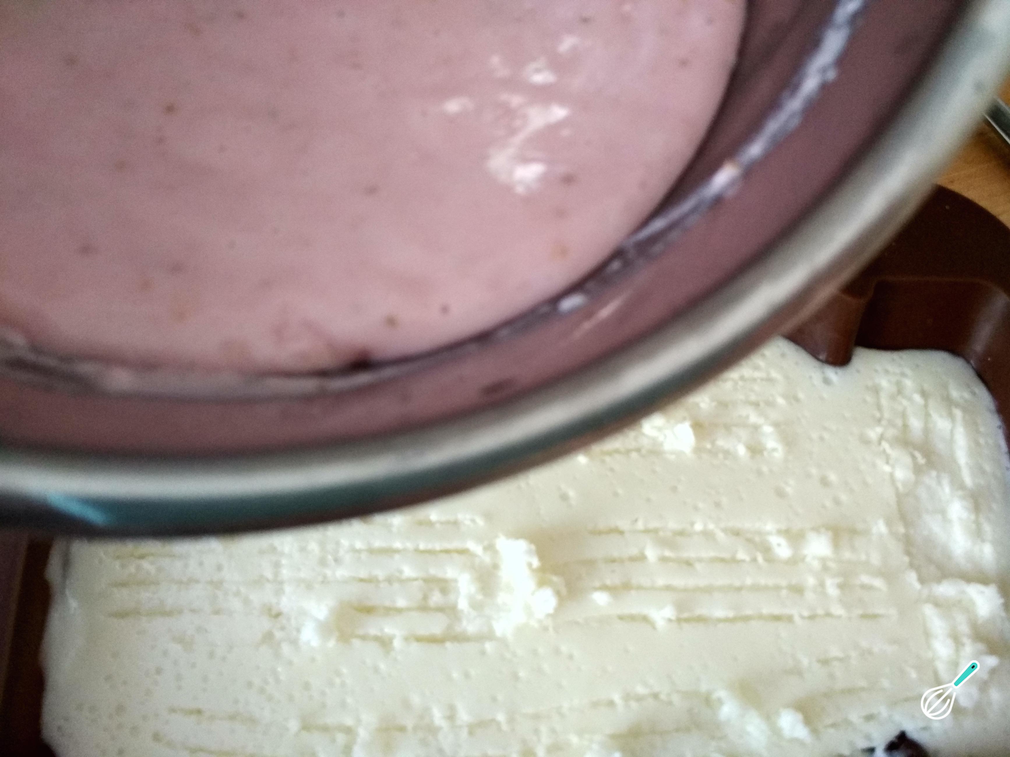Antes de colocar a segunda camada no molde, é necessário passar um garfo pela superfície da primeira camada. Desta forma, as duas camadas ficarão juntas ao invés de se separarem. Em seguida, adicione a camada de morango e coloque na geladeira por 2 horas.