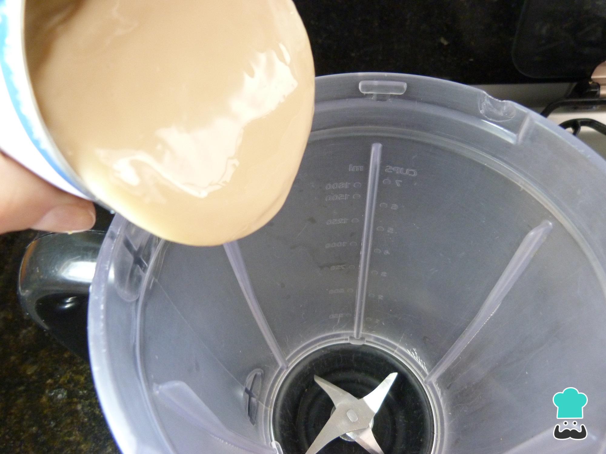 Após o tempo indicado bata no liquidificador a tapioca hidratada com os leites, a manteiga, os ovos e o leite condensado. Reserve.