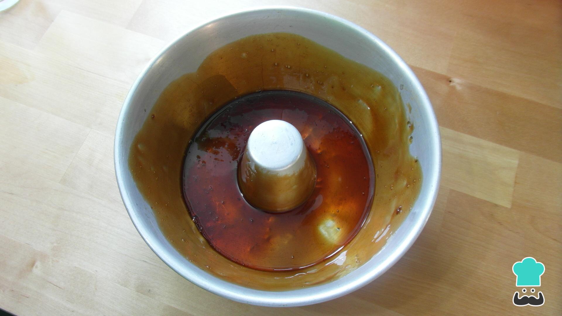 O passo seguinte do pudim de tapioca é preparar a calda de caramelo. Para isso coloque o açúcar diretamente na forma de pudim, leve ao fogo e deixe derreter. Quando estiver dourado, adicione a água, misture e unte as laterais da forma.