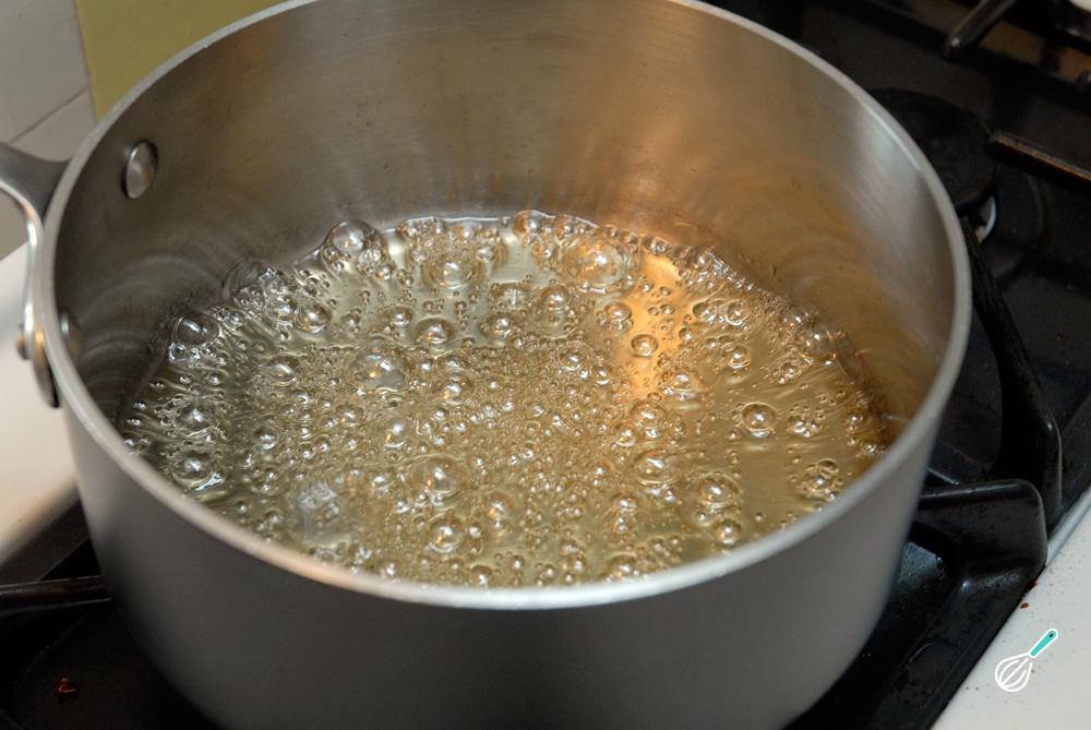 Para fazer a calda, coloque o açúcar e a água em uma panela grossa. Leve ao fogo e deixe ferver, mexendo sempre. Quando as bolhas aumentarem e a calda escurecer, baixe o fogo para não queimar. Minutos depois, a calda começará a caramelizar e ganhar um tom âmbar. Desligue.