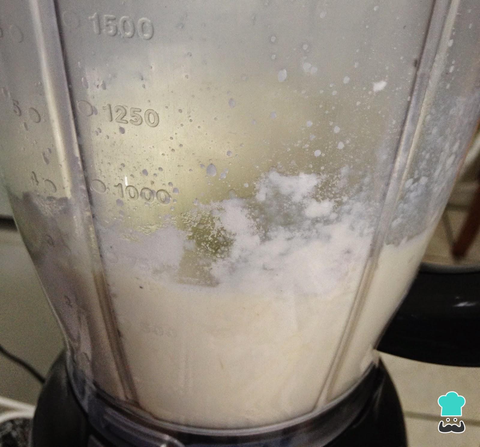 Para fazer esta receita de pudim, comece por juntar todos os ingredientes num liquidificador e deixe bater aproximadamente 5 minutos ou até a mistura estar bem homogênea.