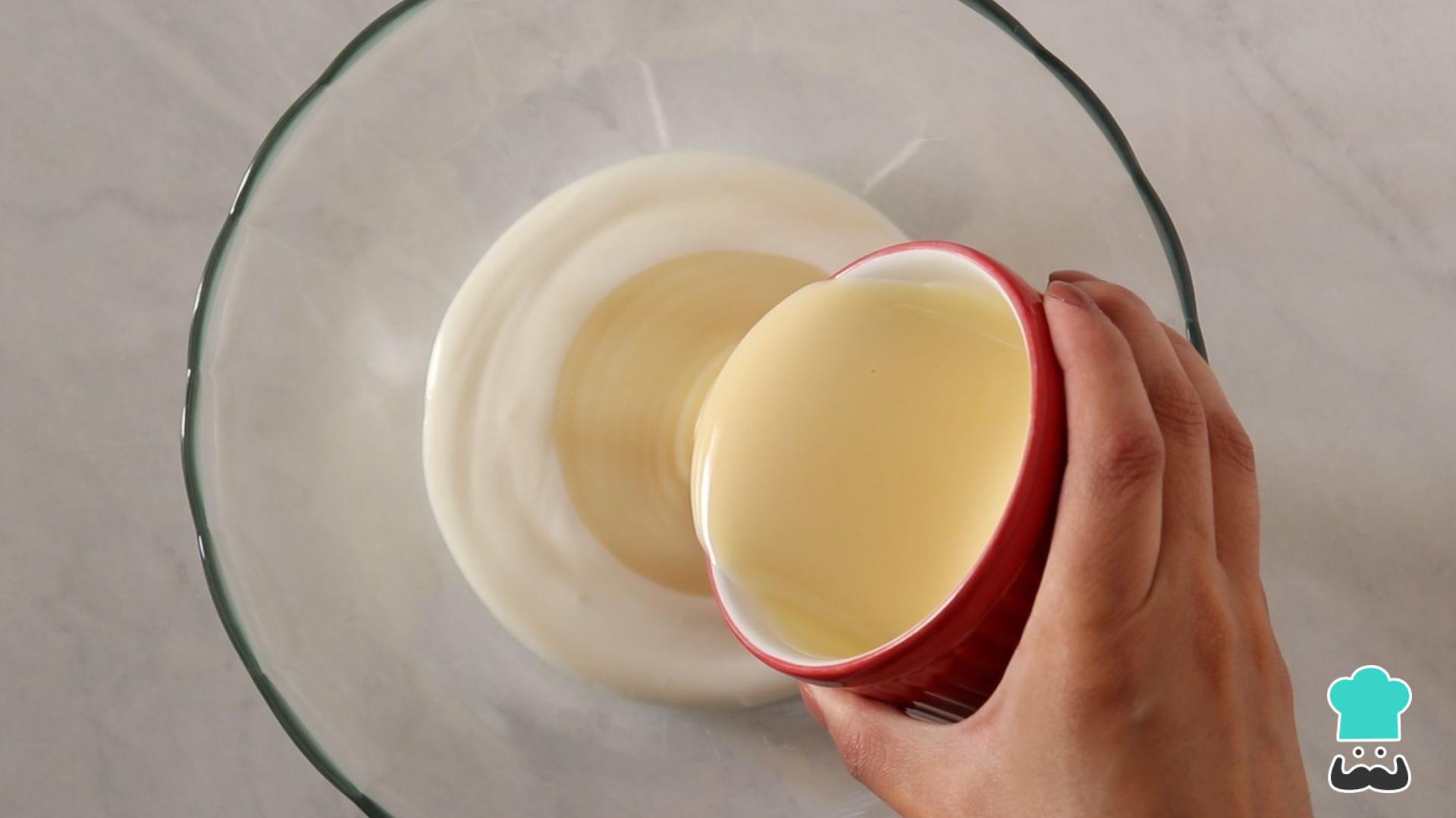 Vamos começar pela massa do pudim, que só leva dois ingredientes: 1 lata de leite condensado e 1 copo de iogurte natural.