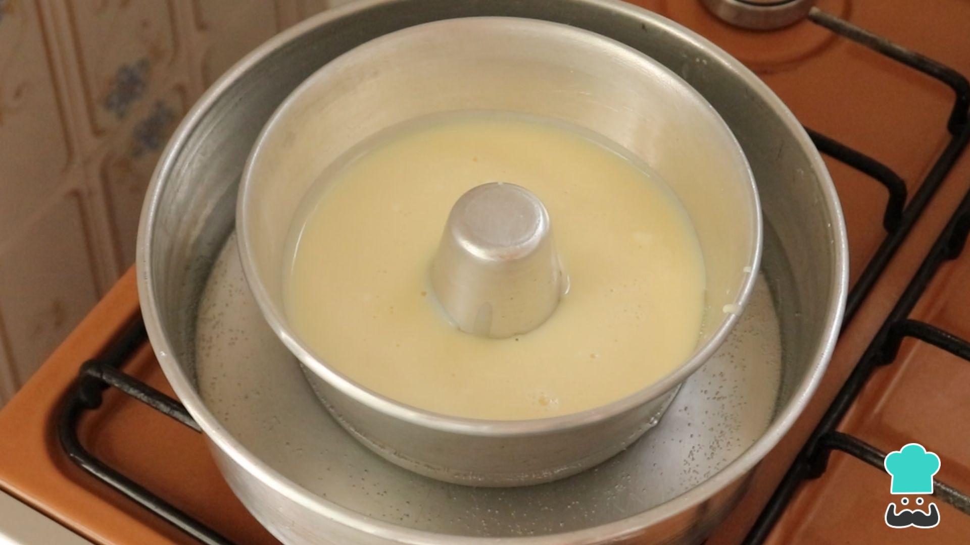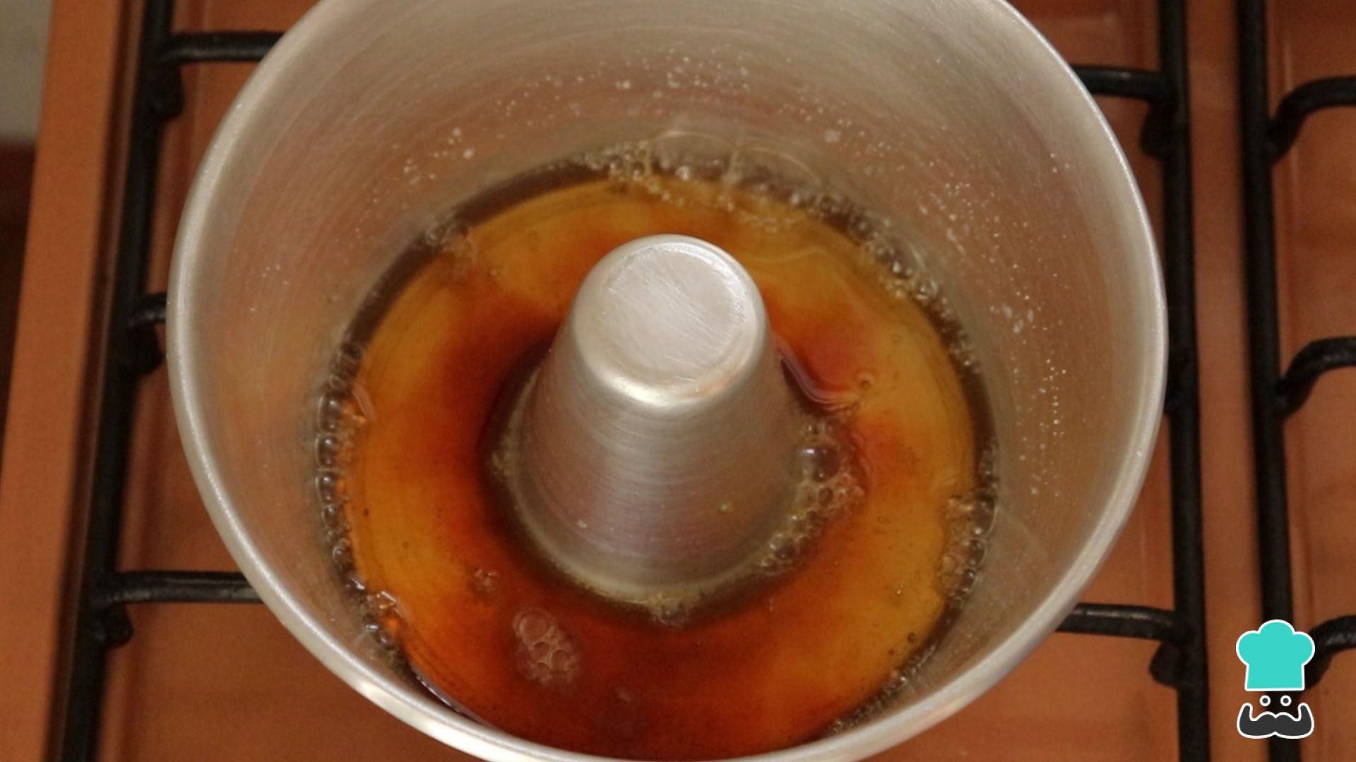 Leve ao fogo baixo e espere com muita paciência até virar caramelo. Depois despeje a massa do pudim na forma com o caramelo, sem esperar esfriar.