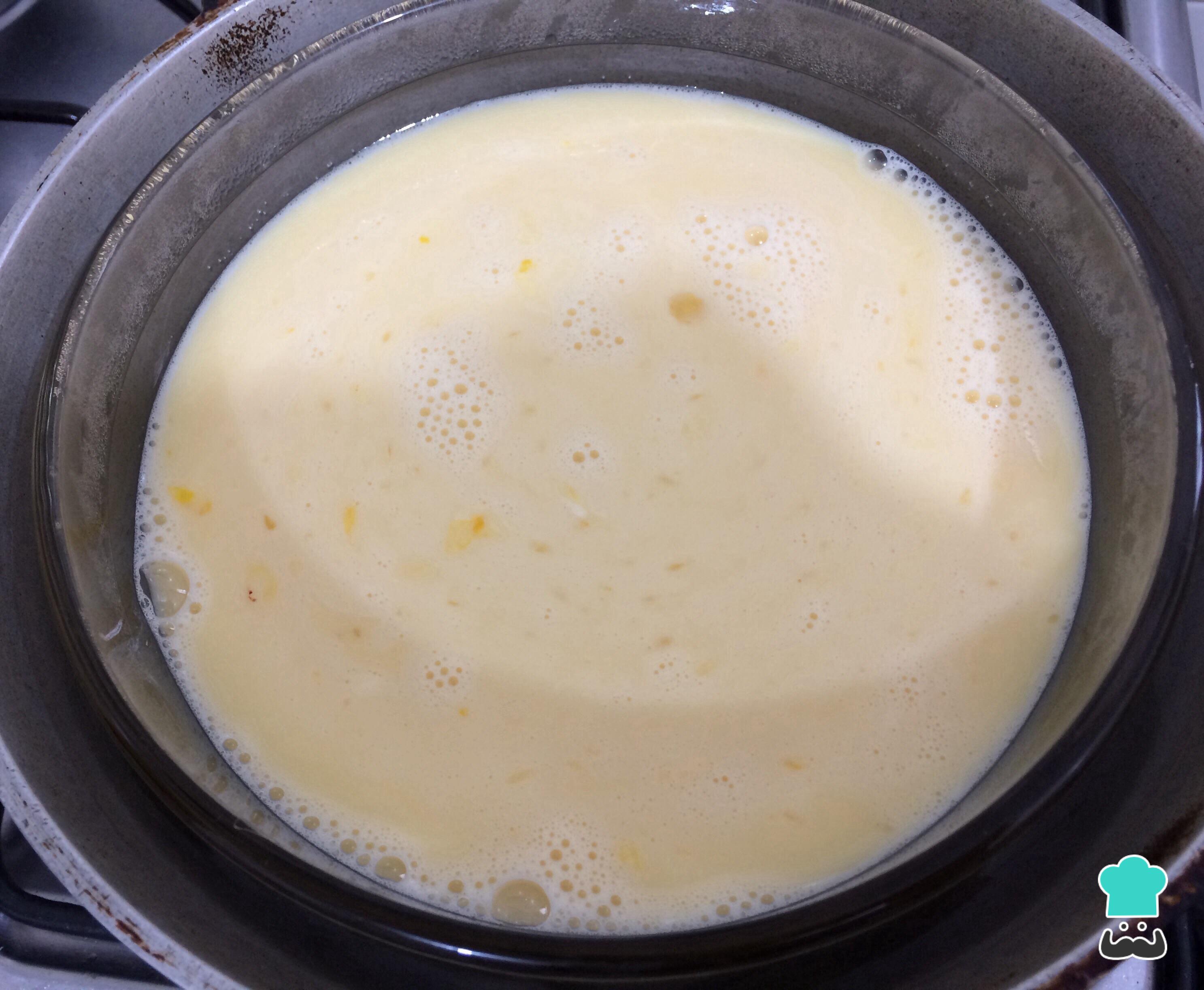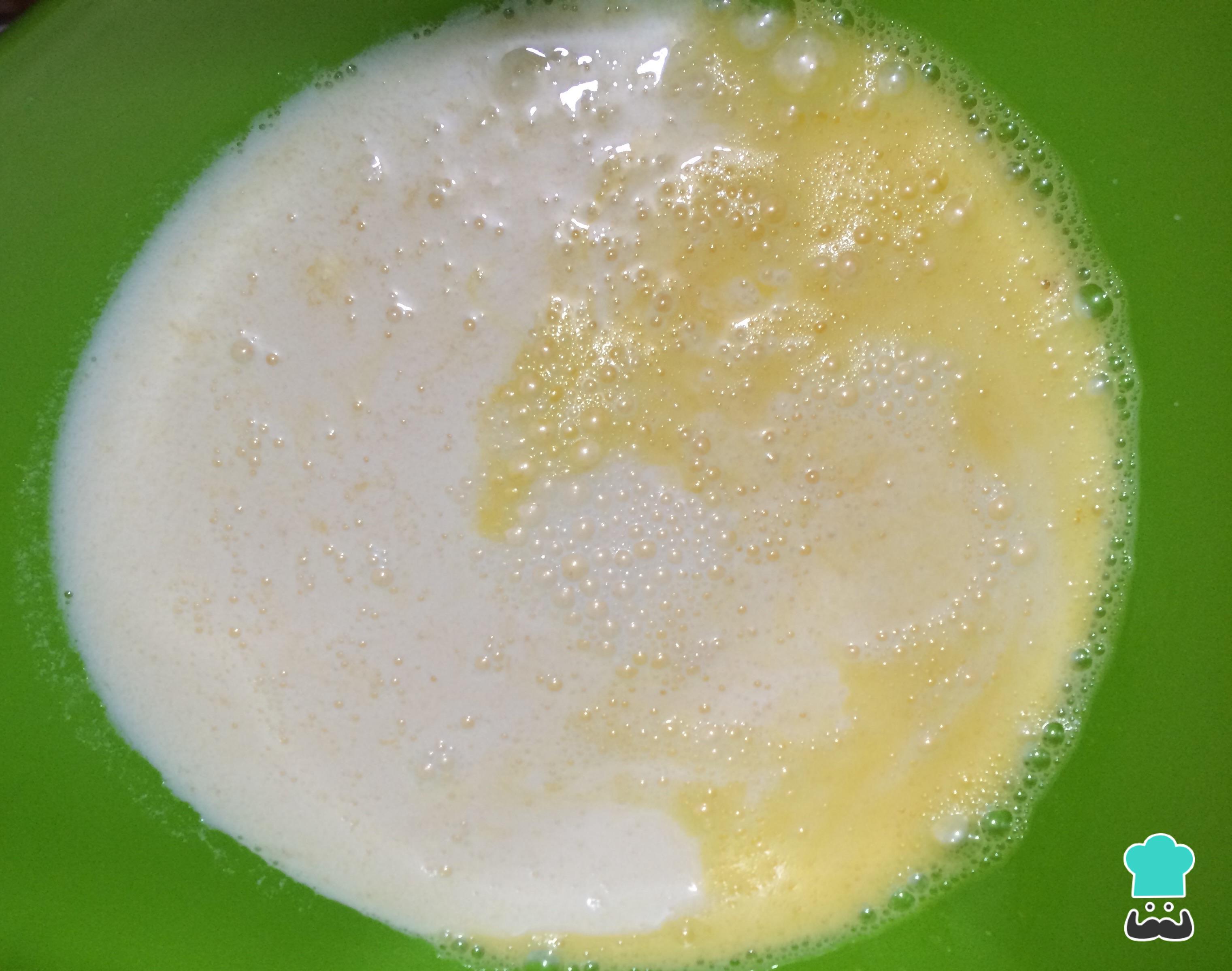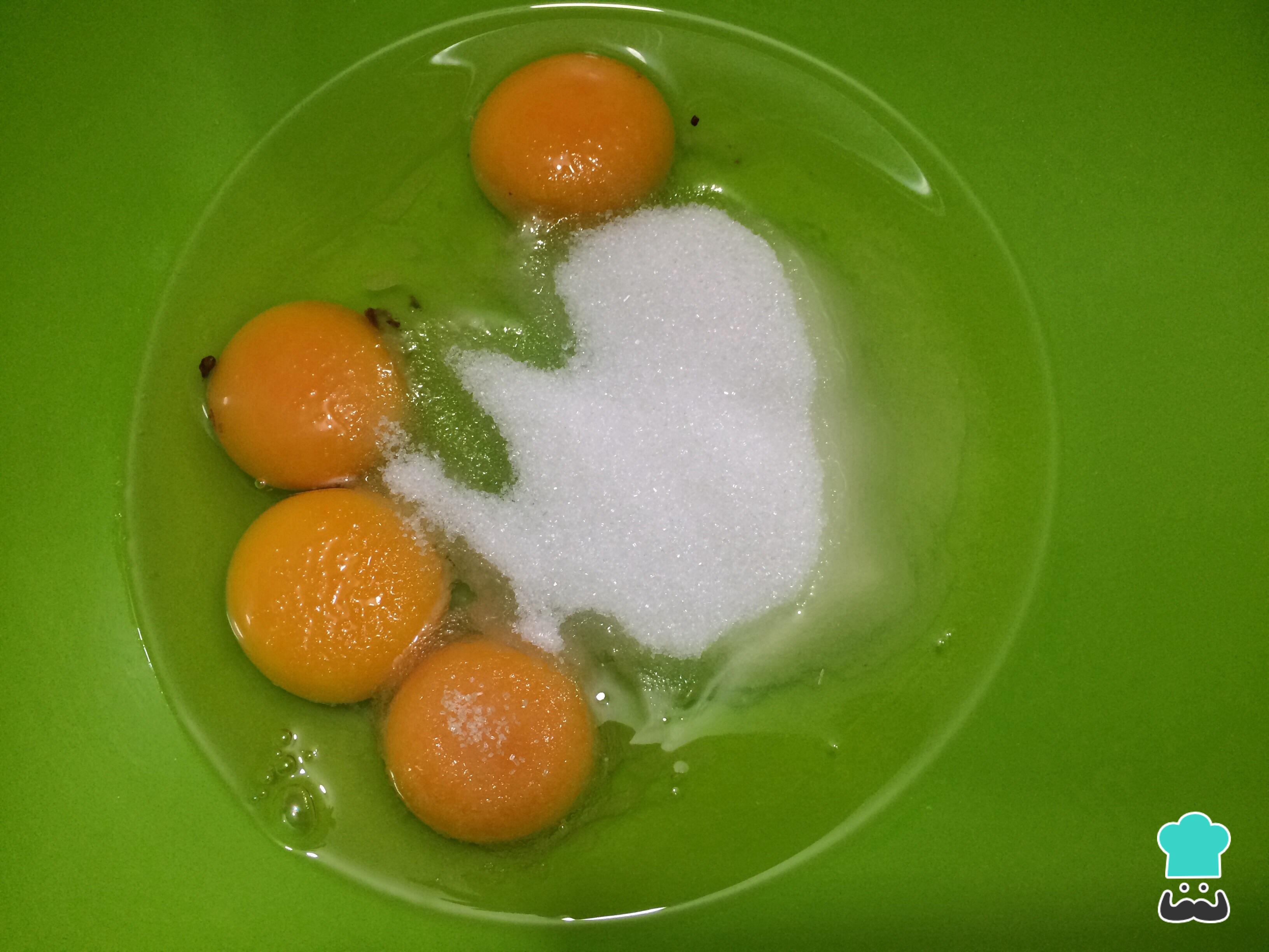 Em uma tigela bata os ovos com o açúcar, até obter uma mistura homogênea e sem grãos de açúcar visíveis.