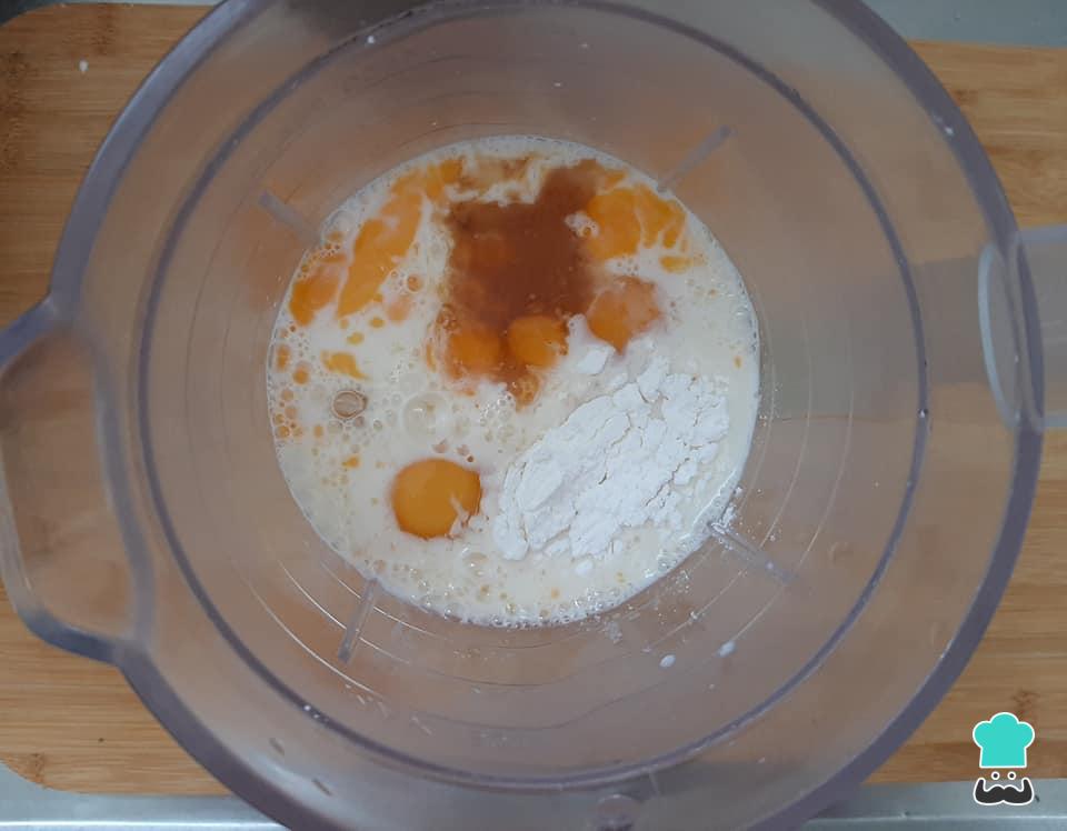 Bata no liquidificador, os ovos, o açúcar, o leite, o amido de milho, a essência de baunilha e o suco de laranja, até que o líquido fique bem homogêneo.