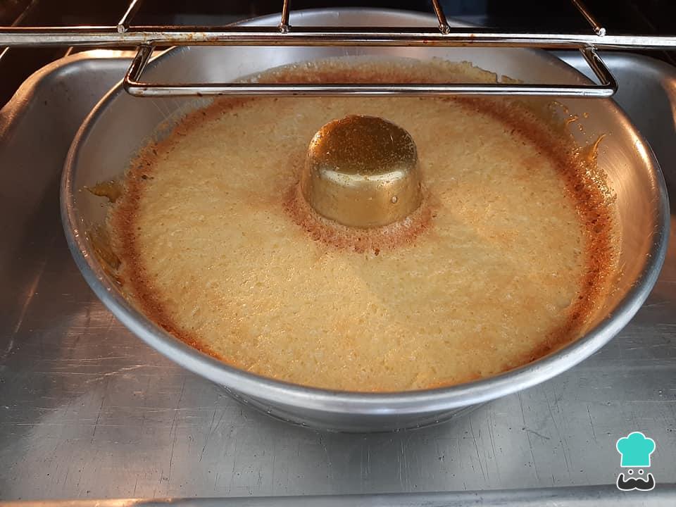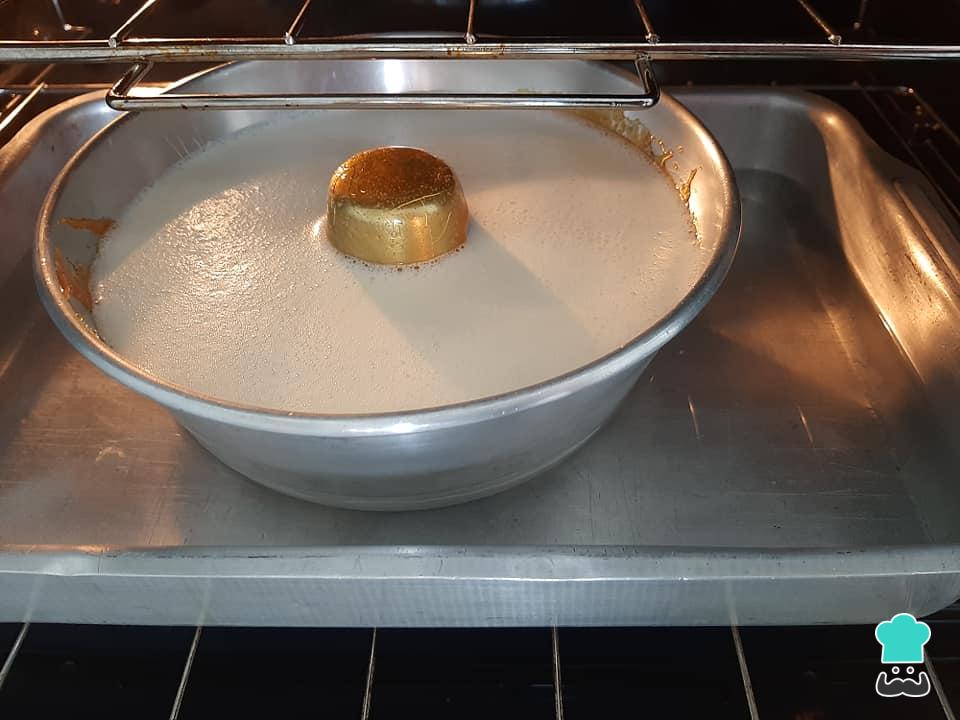Dica: aqueça a água previamente para colocar na assadeira que irá acomodar a forma do pudim.