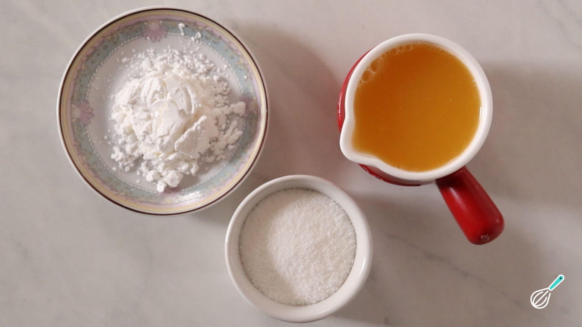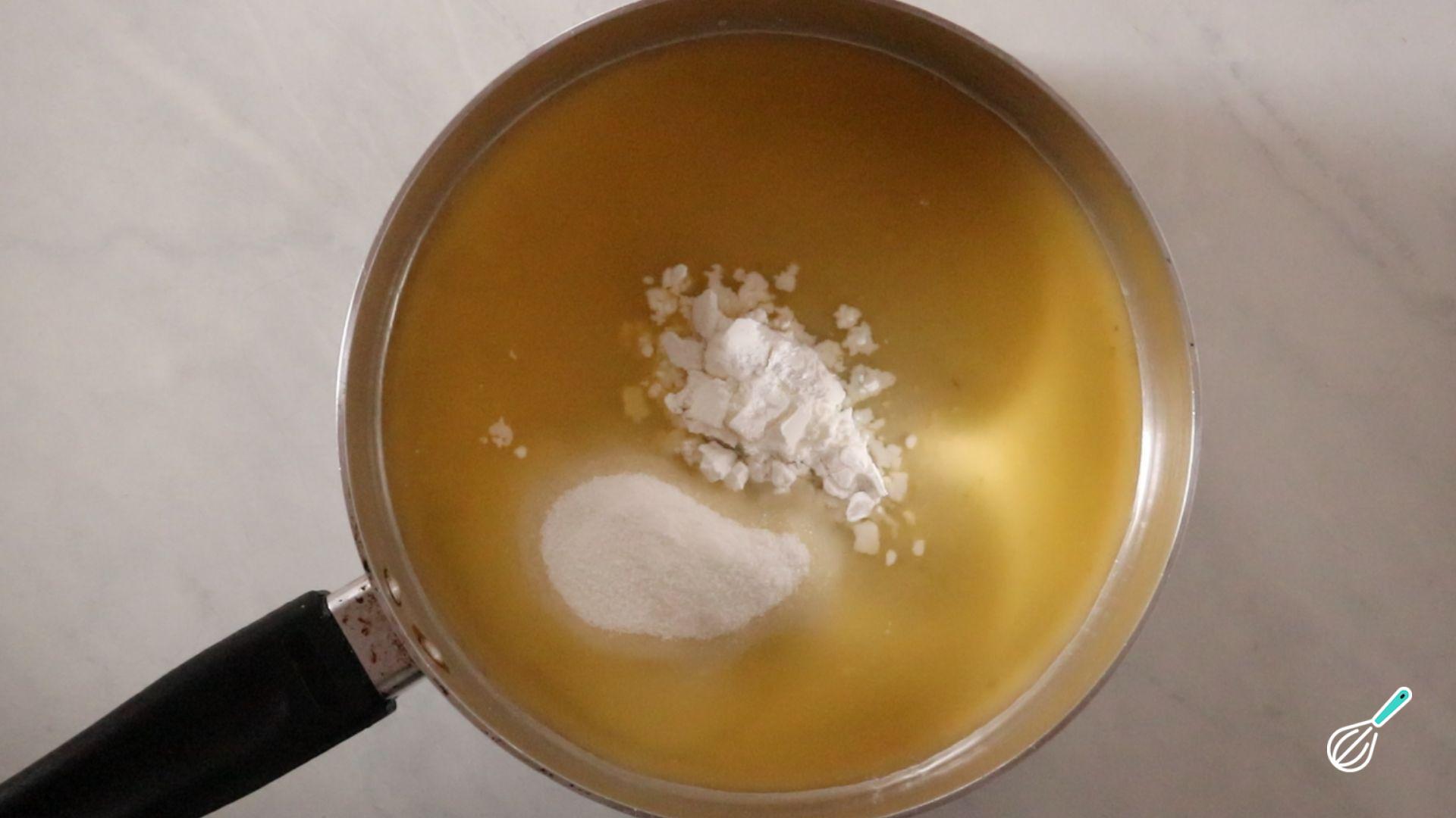 Em uma panela misture o suco, o amido de milho e o açúcar. Misture bem para diluir totalmente o amido de milho.
