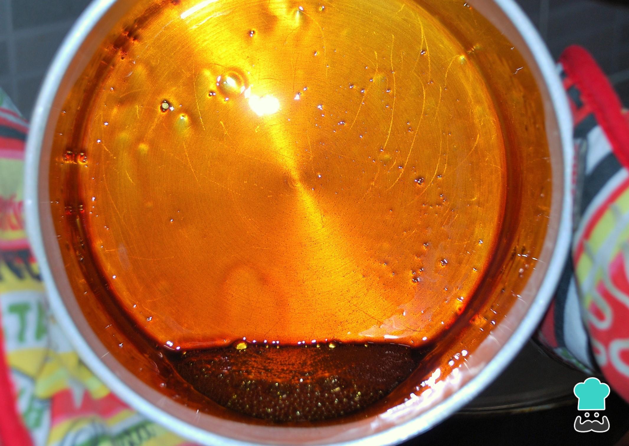 Quando o caramelo estiver em cor âmbar, desligue o fogo e, com cuidado, espalhe-o nas laterais da forma girando a forma ou usando um pincel. Reserve.