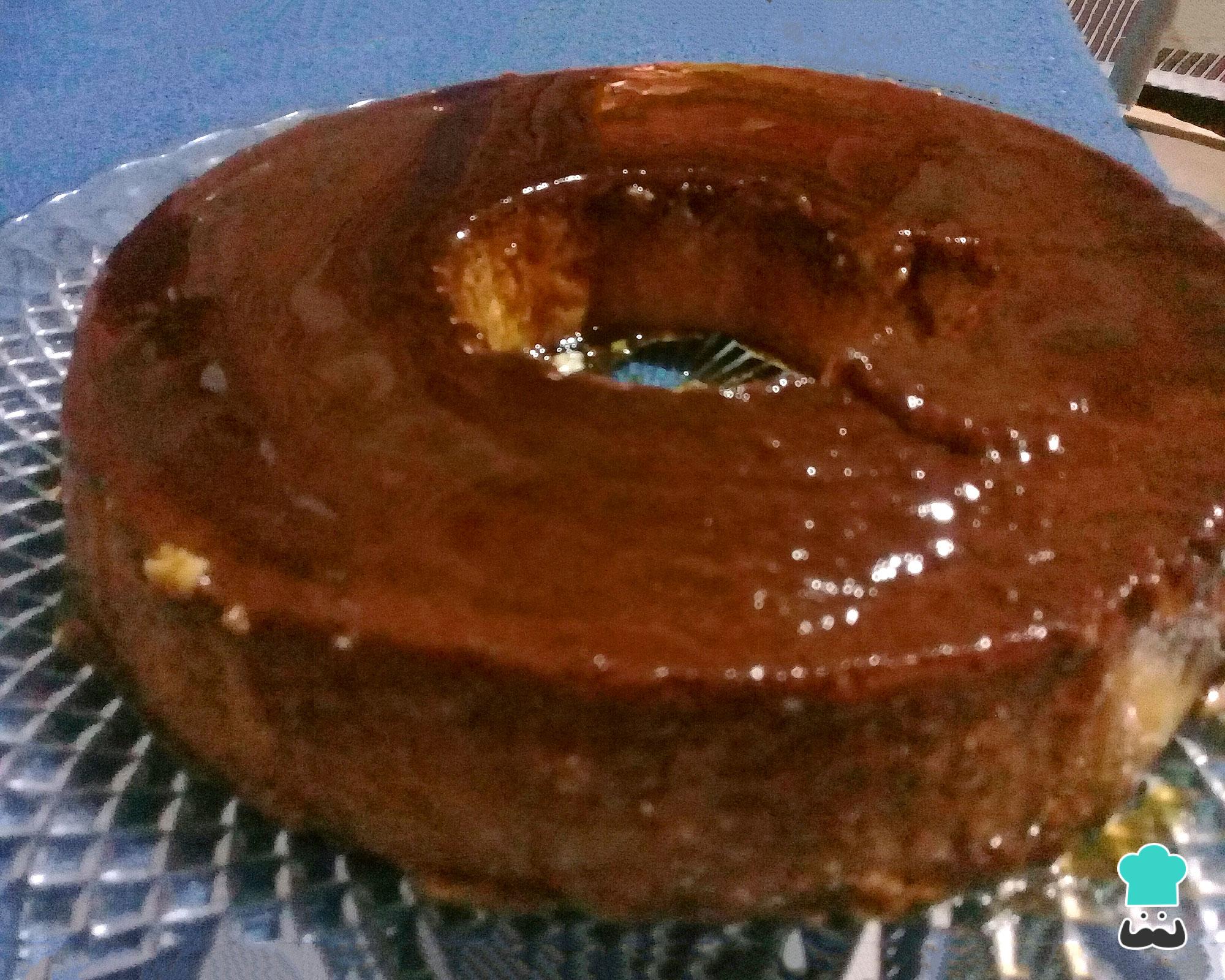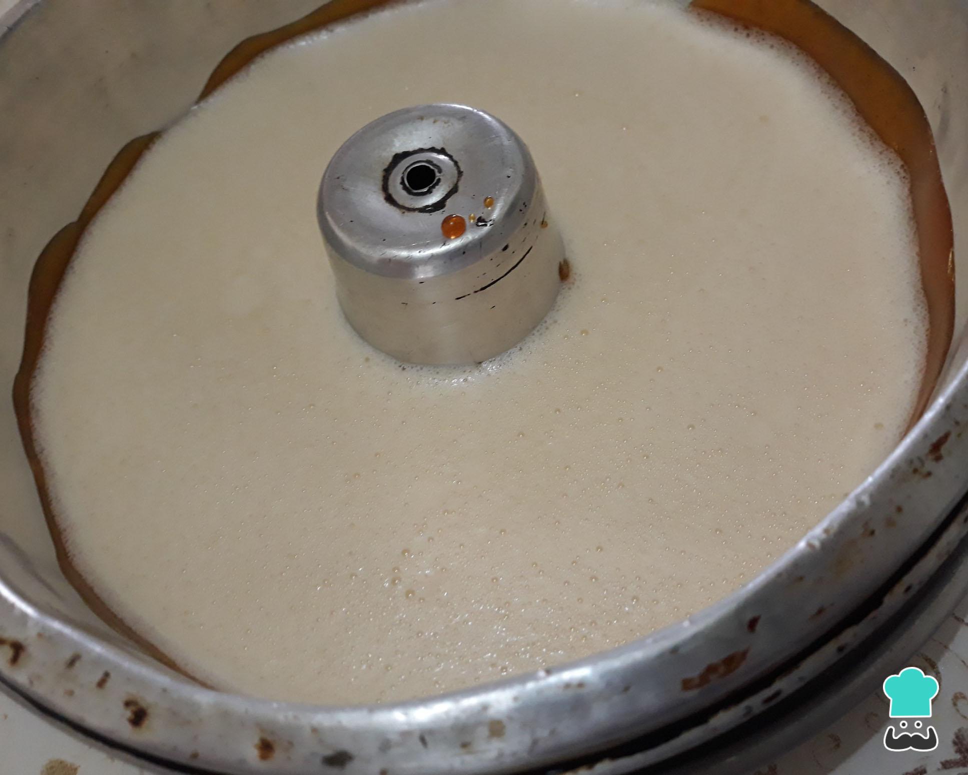 Numa forma de pudim espalhe a calda de caramelo, cobrindo o fundo e as laterais. Despeje a mistura do liquidificador e leve ao forno em banho-maria. Deixe por 2 horas ou até dourar e ficar firme.