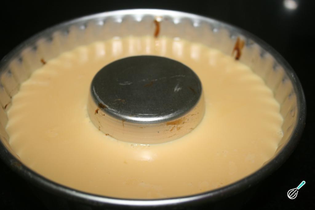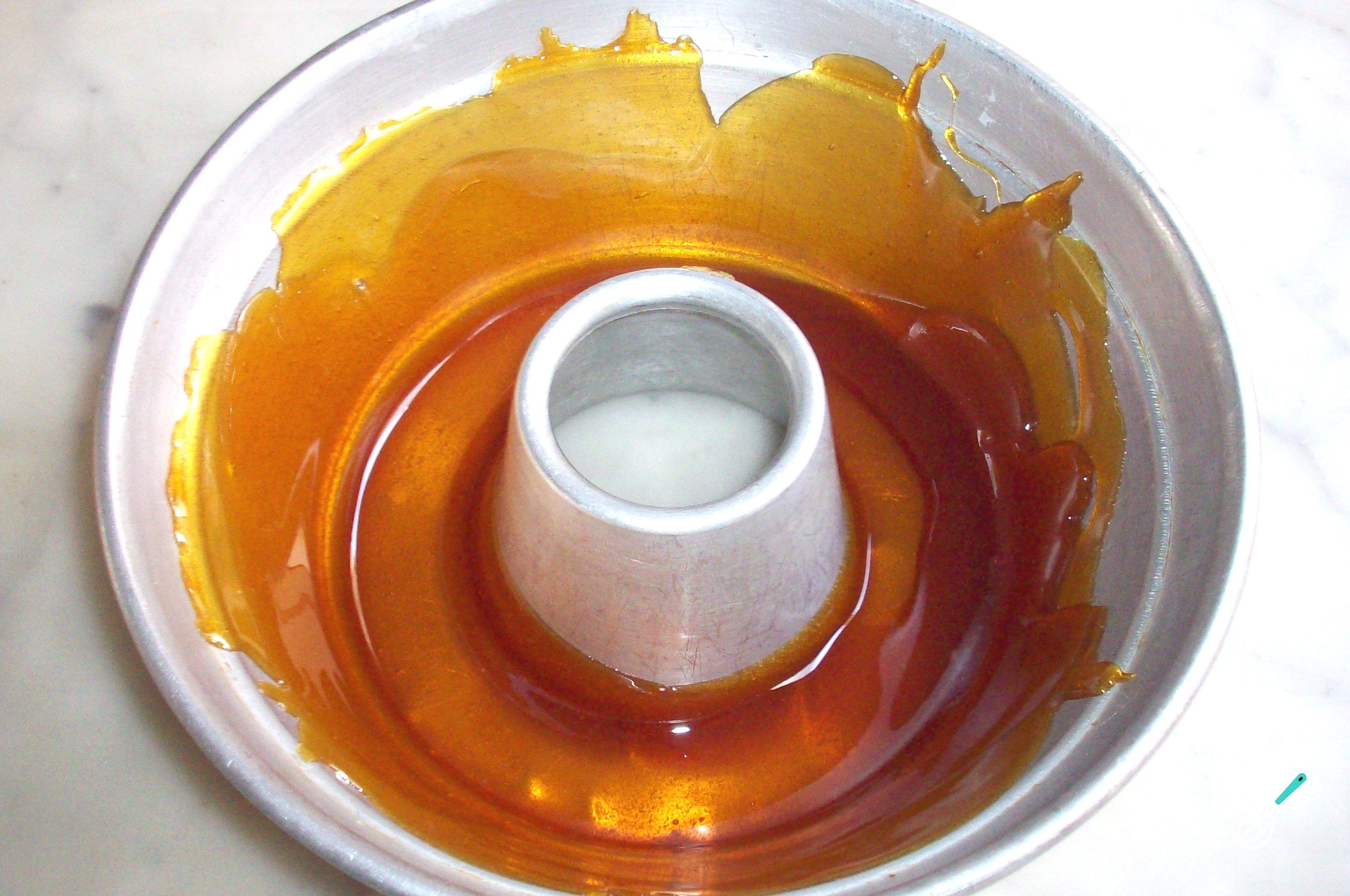 Despeje o caramelo líquido no fundo da forma de pudim. Acesse essa receita de caramelo líquido caseiro para fazer a sua própria calda em casa.