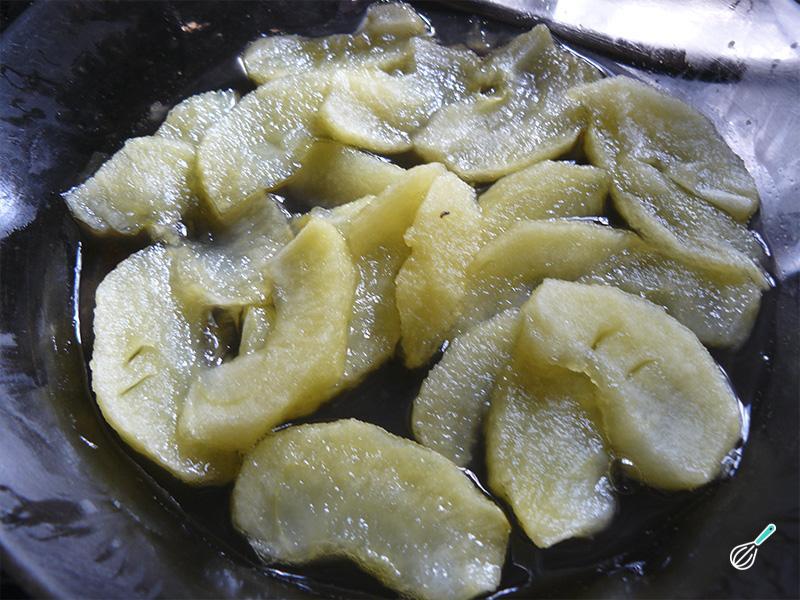Descasque a maçã para o pudim de microondas e corte-a em fatias pequenas. Polvilhe com açúcar e leve ao microondas até obter um xarope de maçã.