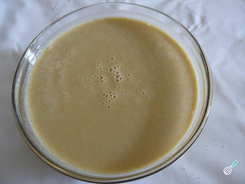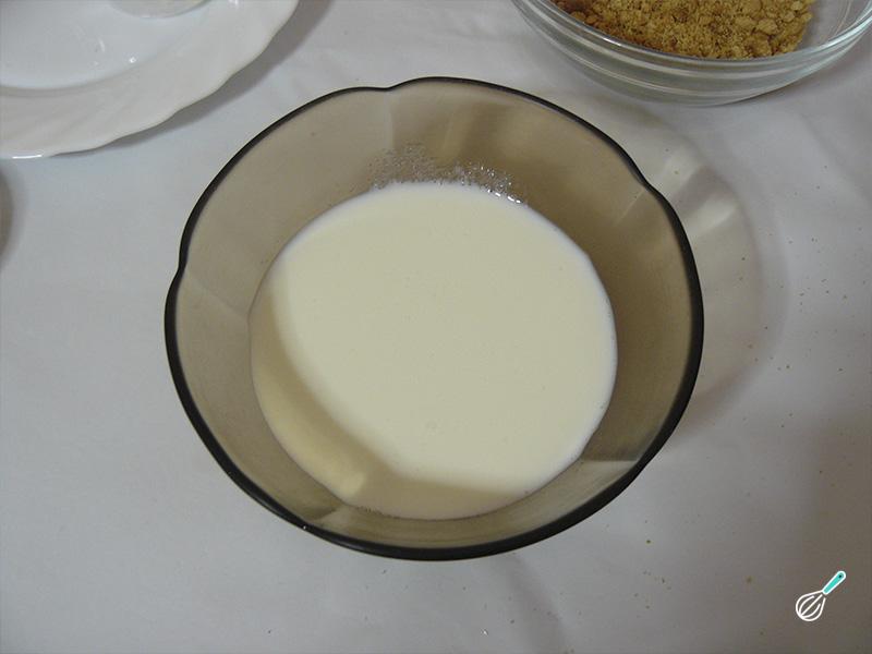 Aqueça o leite no microondas por alguns minutos. Em seguida, adicione a essência de limão para continuar com a preparação do pudim de maçã e biscoito no microondas.