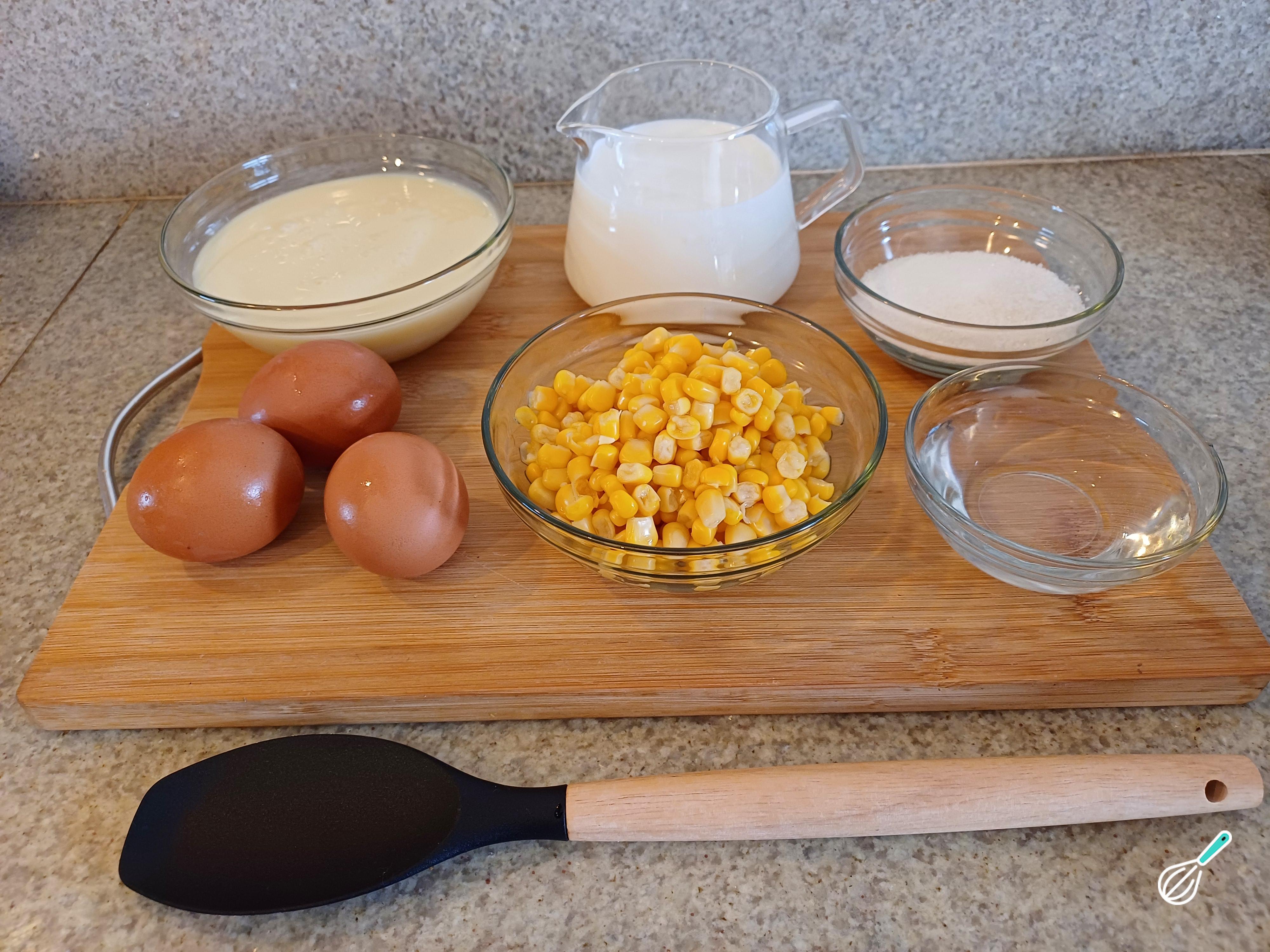 Separe todos os ingredientes necessários para o preparo do pudim de milho.