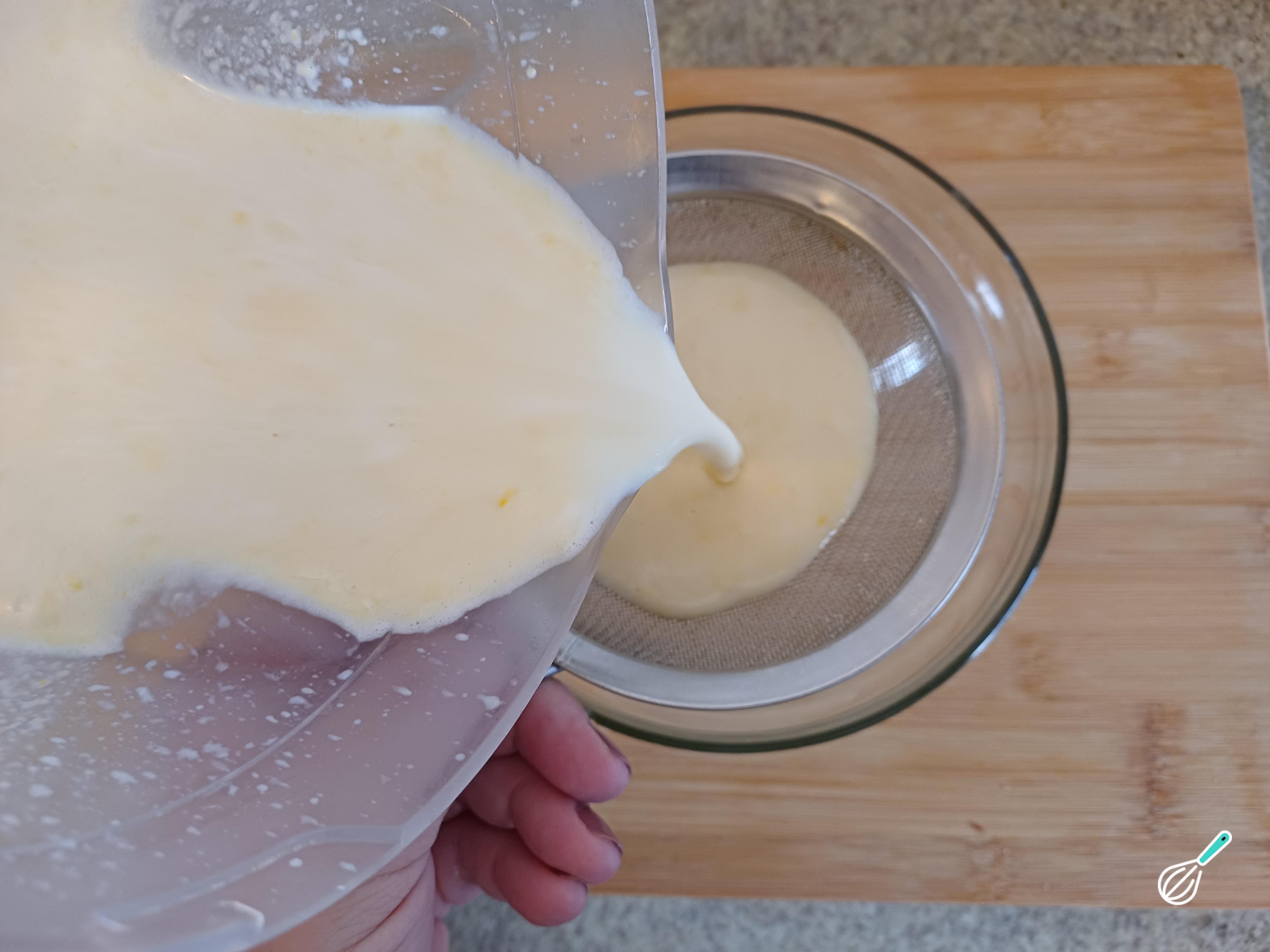 Coe a mistura para remover as cascas do milho, e descarte as cascas, reserve somente o líquido coado para deixar o pudim mais lisinho.