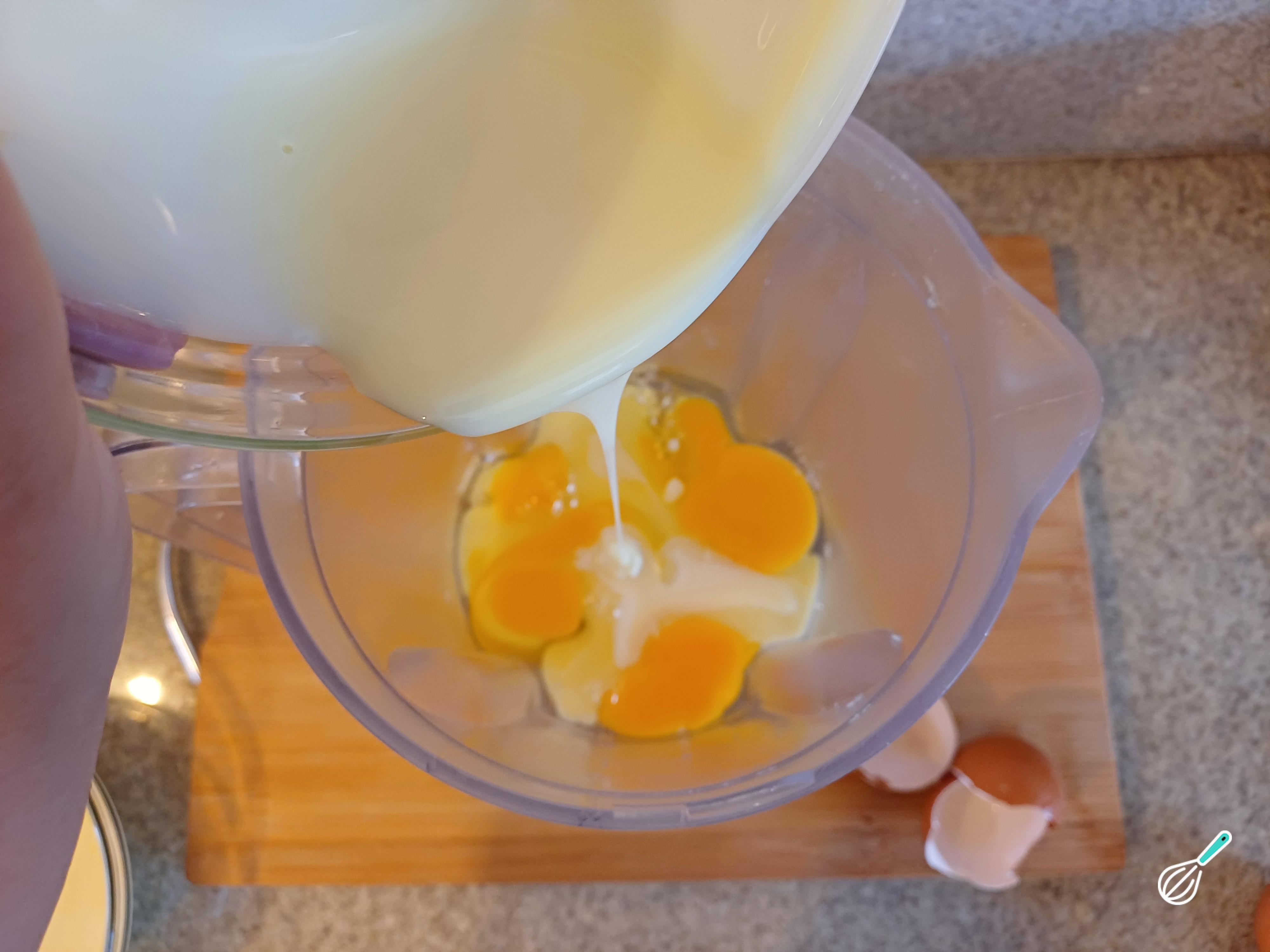 Volte esse líquido para o liquidificador limpo, e adicione os ovos e o leite condensado.