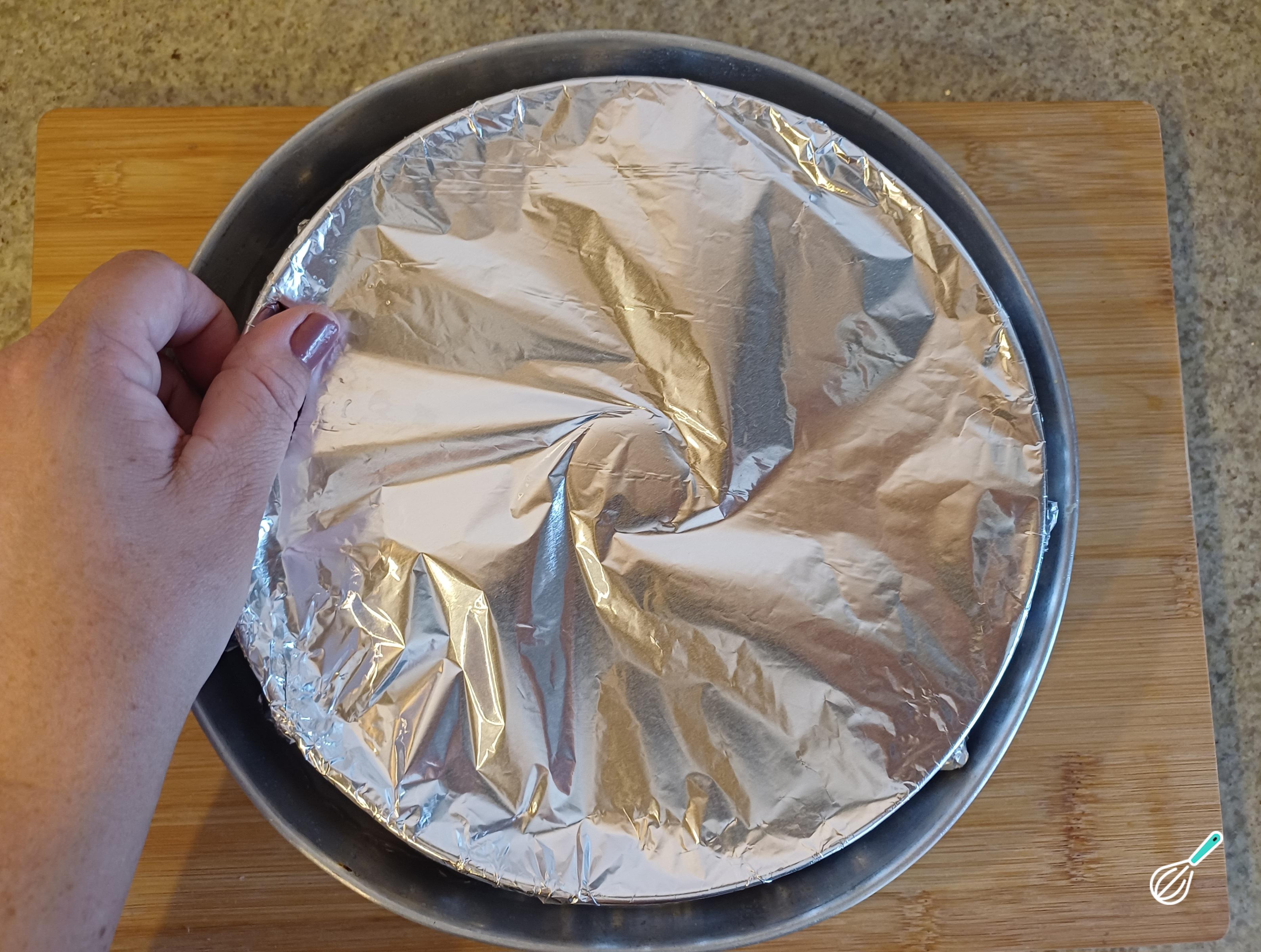 Despeje a mistura na forma caramelizada e cubra com papel-alumínio.
