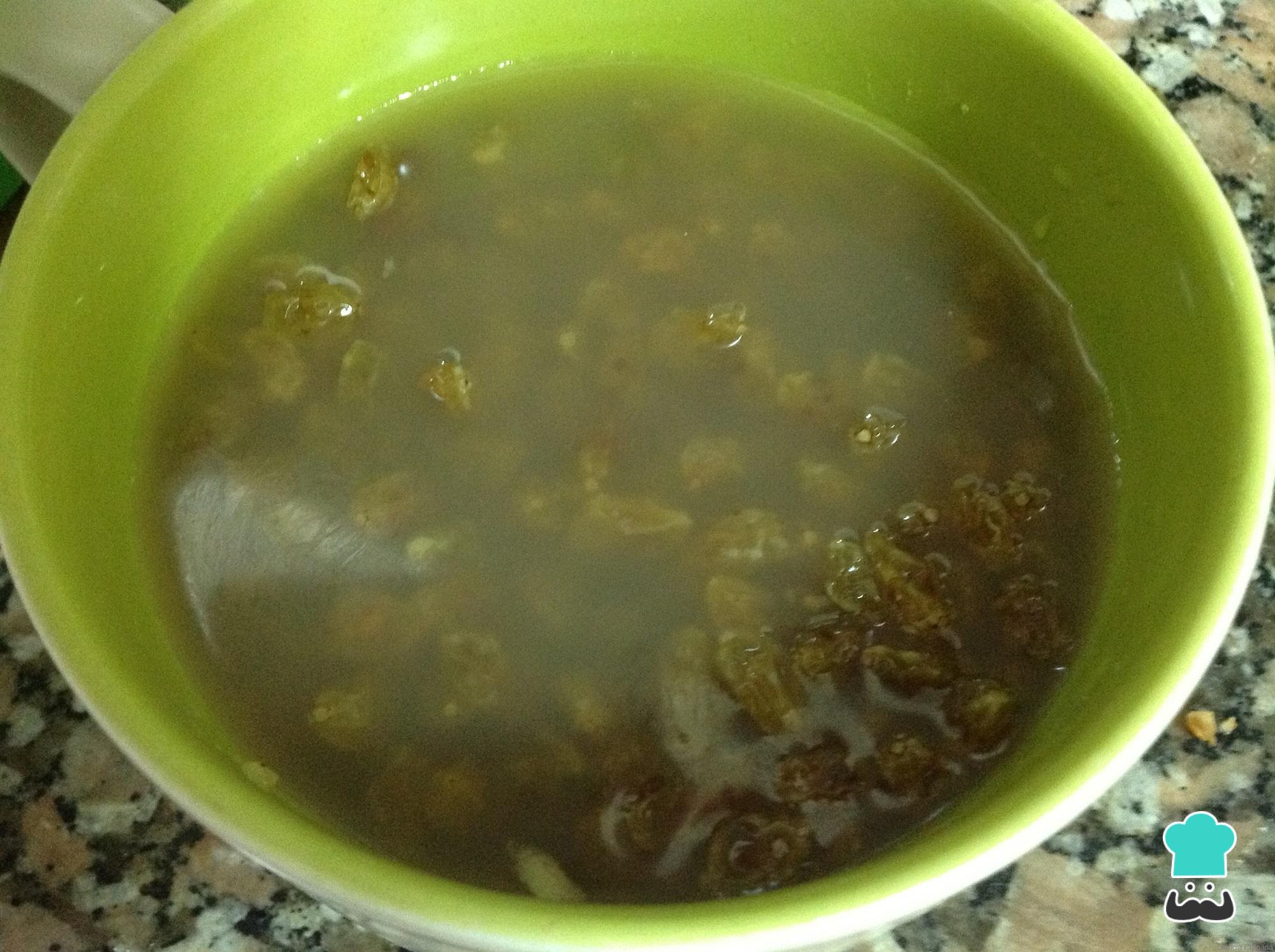 Para preparar este pudim de frutas secas comece por hidratar as uvas-passa em água quente por uns minutinhos e escorrer.