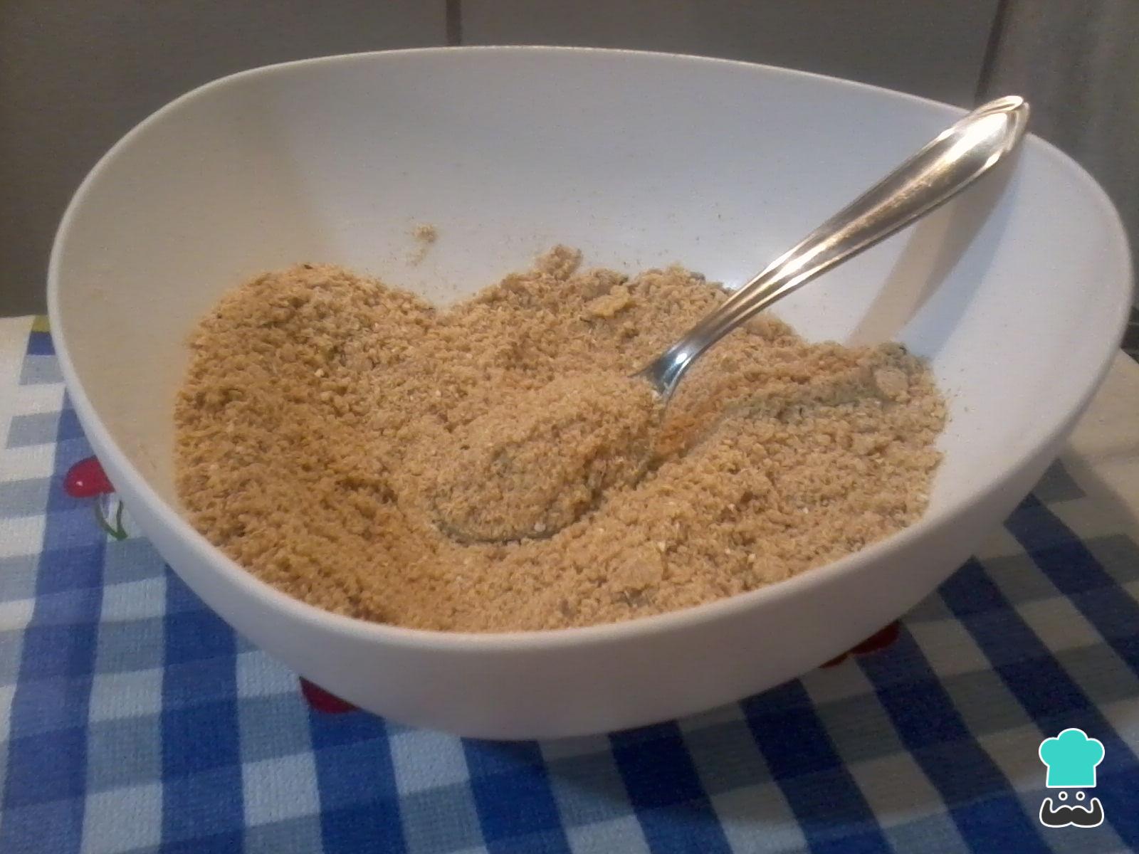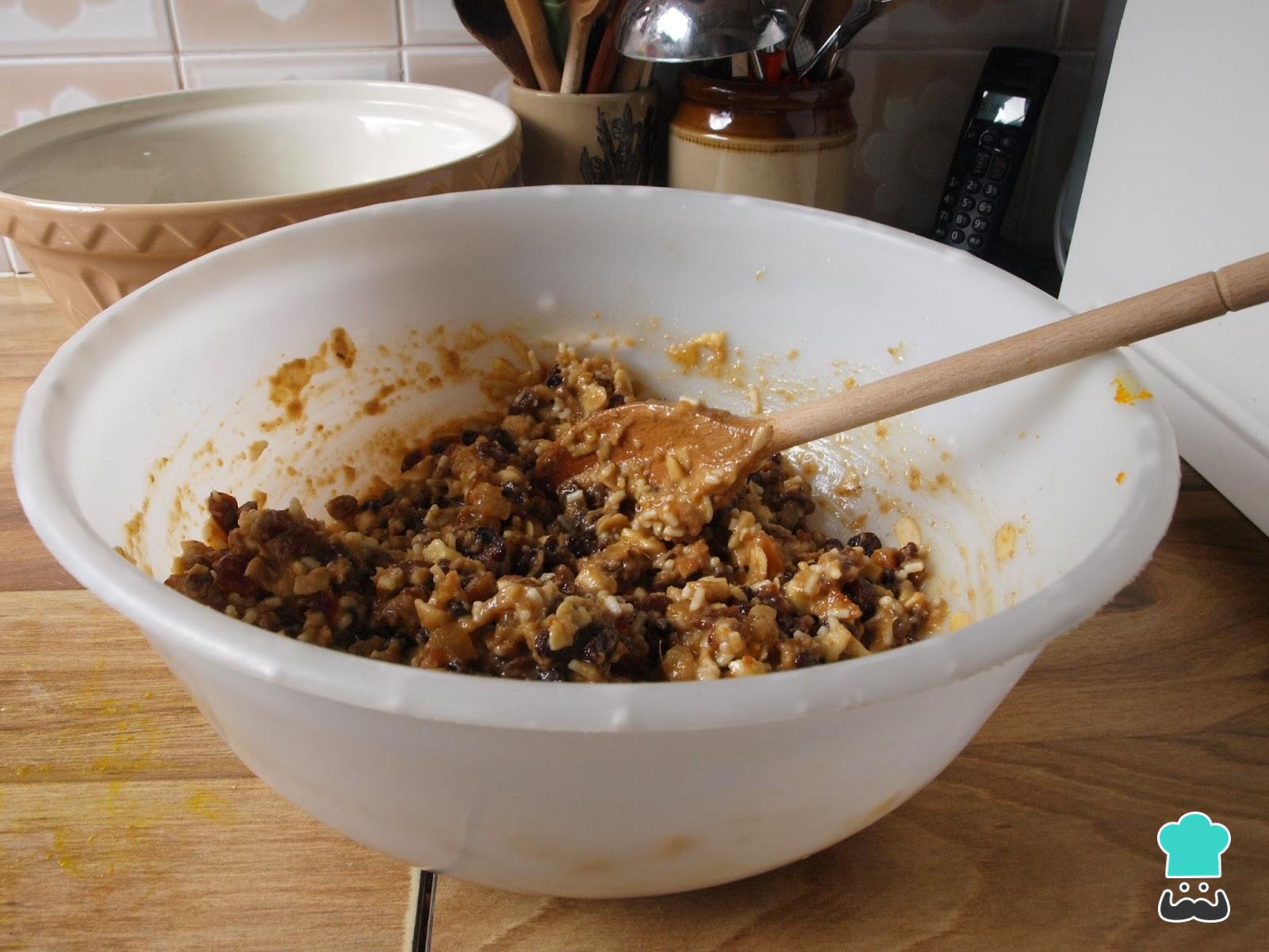Em um recipiente à parte misture a farinha de trigo, o miolo de pão esfarelado, o açúcar, a manteiga e as especiarias. Acrescente as raspas de laranja e limão e a maçã ralada e volte a misturar tudo.