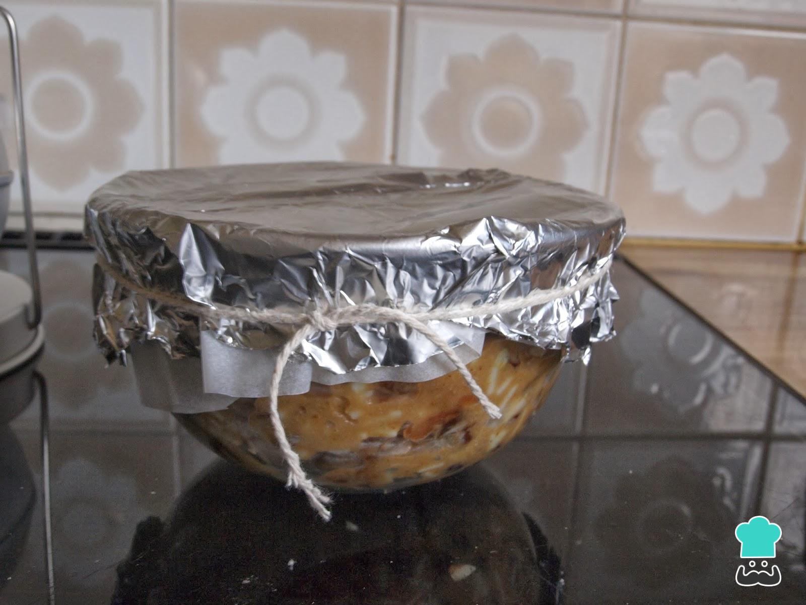 Verta a massa do bolo-pudim inglês para uma forma untada, cubra com papel manteiga depois com papel alumínio. Asse em banho-maria, no fogão (fogo baixo) ou no forno (100ºC), por 5-6 horas.