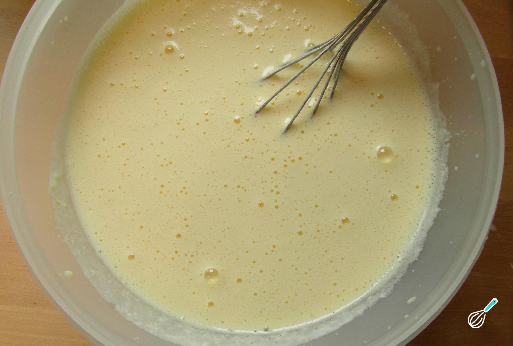 É muito fácil de fazereste pudim caseiro! Comece por bater os ovos, adicionar o leite condensado e o leite e continuar batendo.
