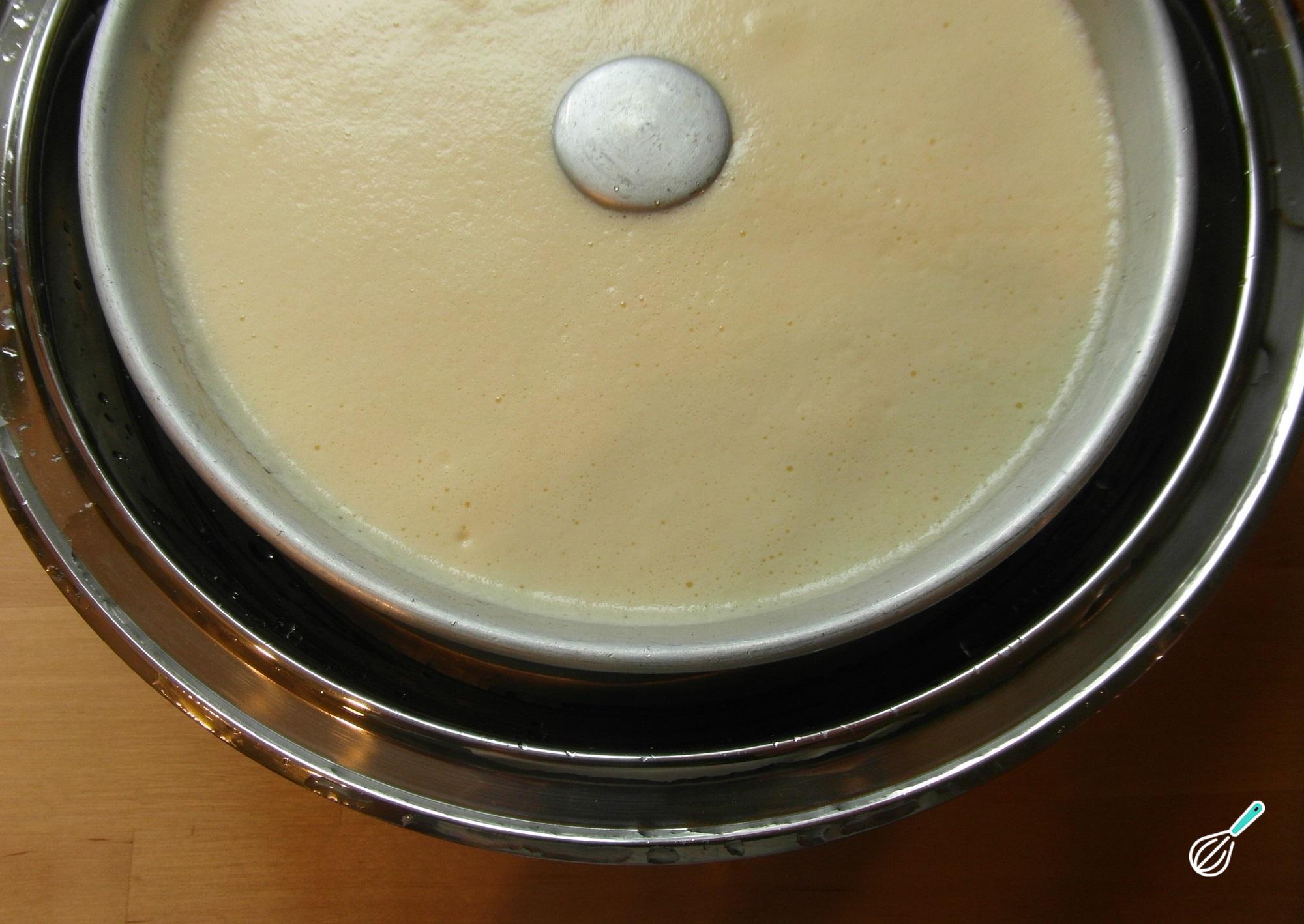 Coloque sobre uma bandeja com água, para cozinhar em banho-maria, e leve ao forno preaquecido a 180ºC por 30 minutos, ou até estar consistente.