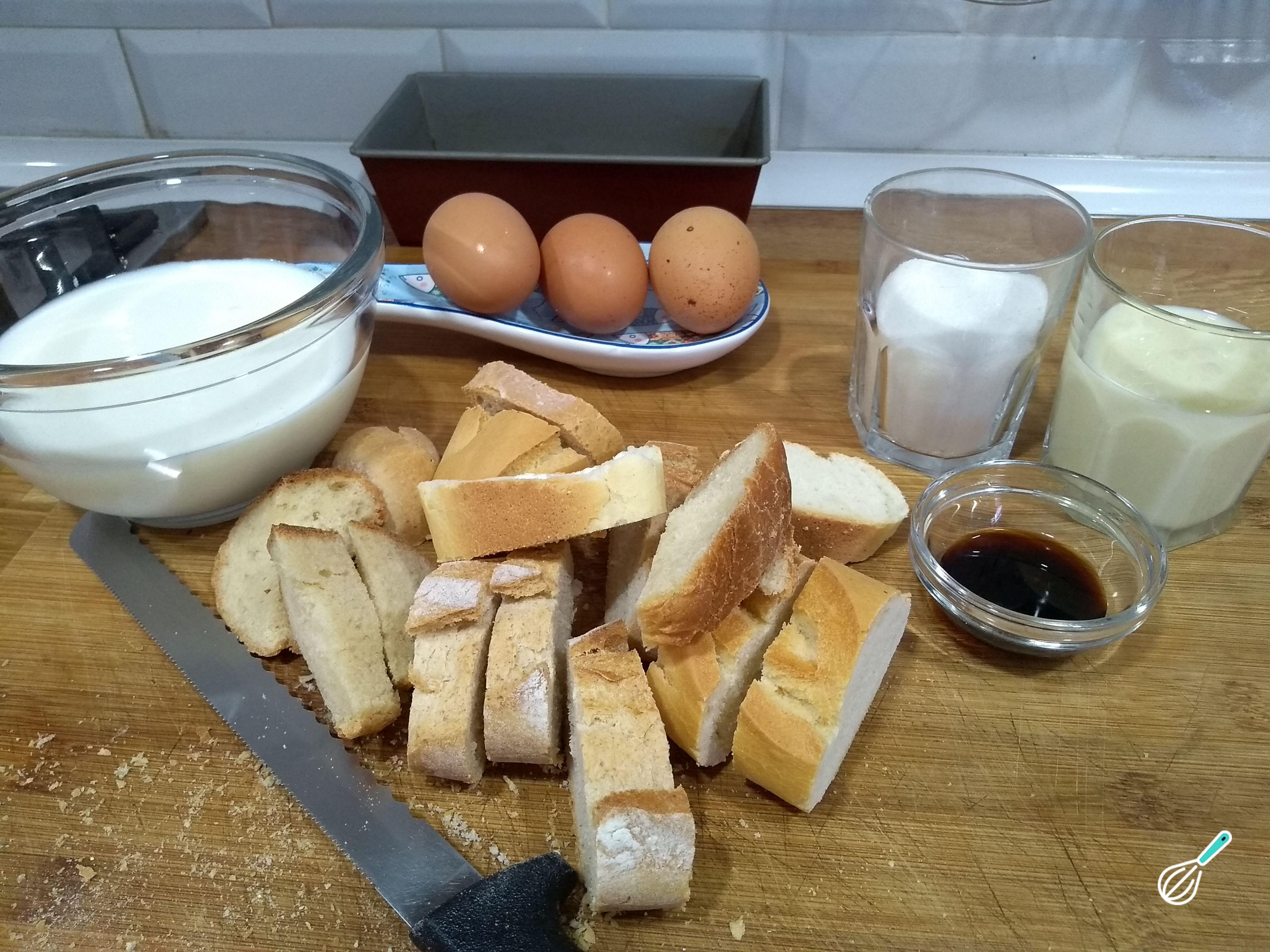 Corte o pão duro em fatias e coloque de molho no leite morno por 30 minutos - o pão deve ficar completamente embebido no leite, para que fique mais macio ao fim desse tempo. Enquanto isso preaqueça o forno a 180°C, coloque água numa assadeira (cerca de dois dedos de água) e coloque no forno, para esquentar essa água e assim assar o pudim em banho-maria.