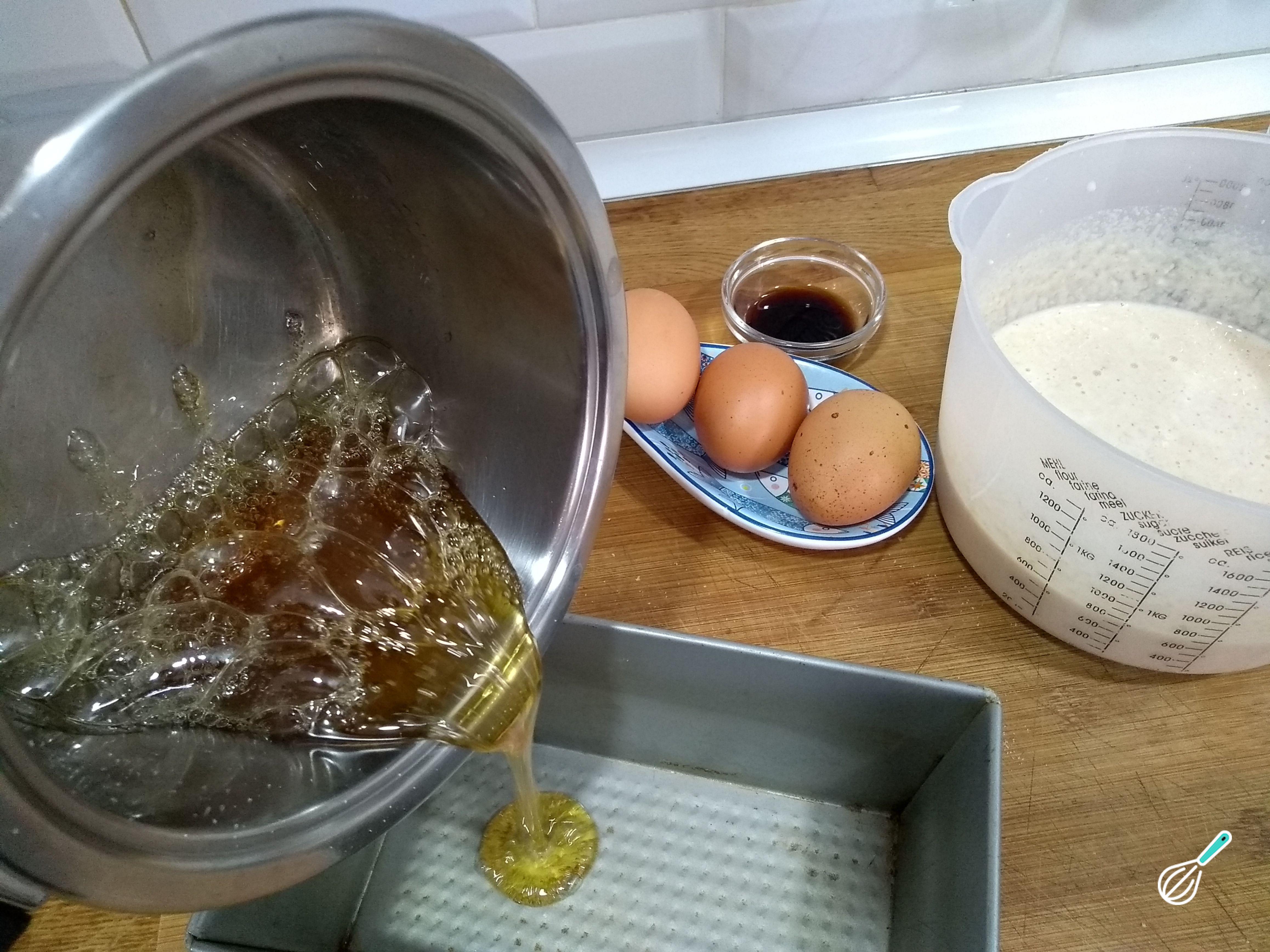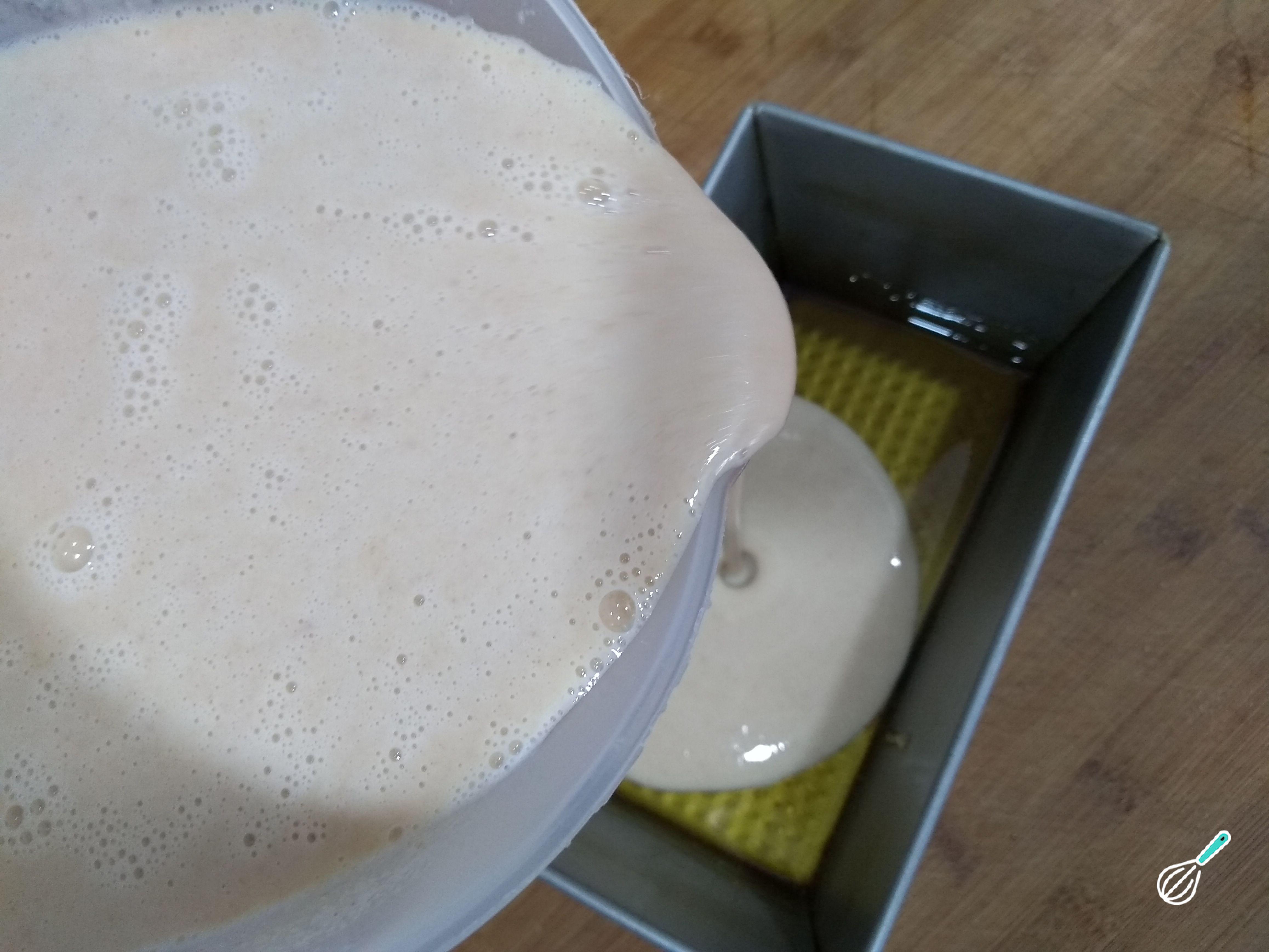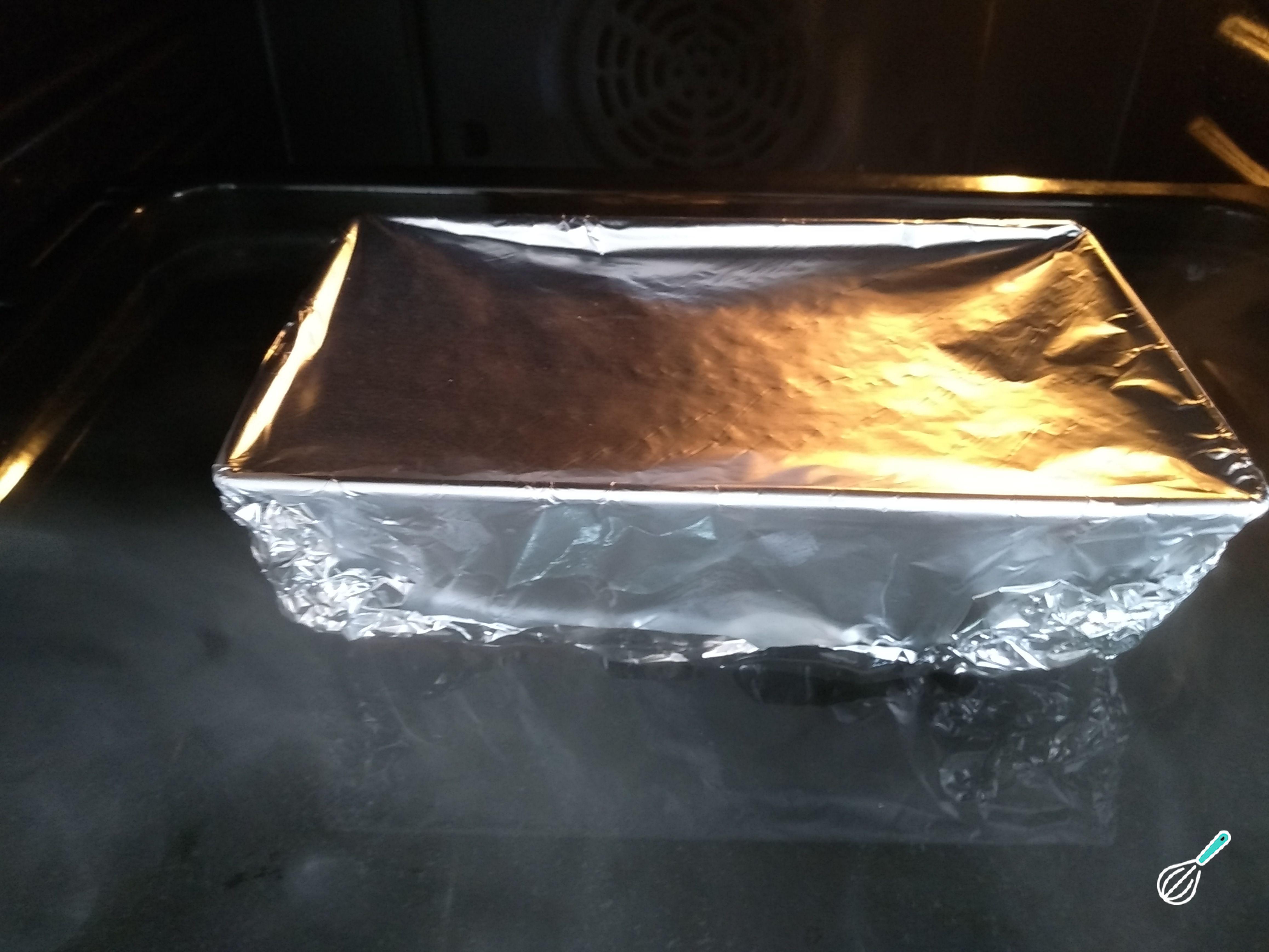 Despeje essa mistura na forma de pão caramelada e cubra com papel alumínio.