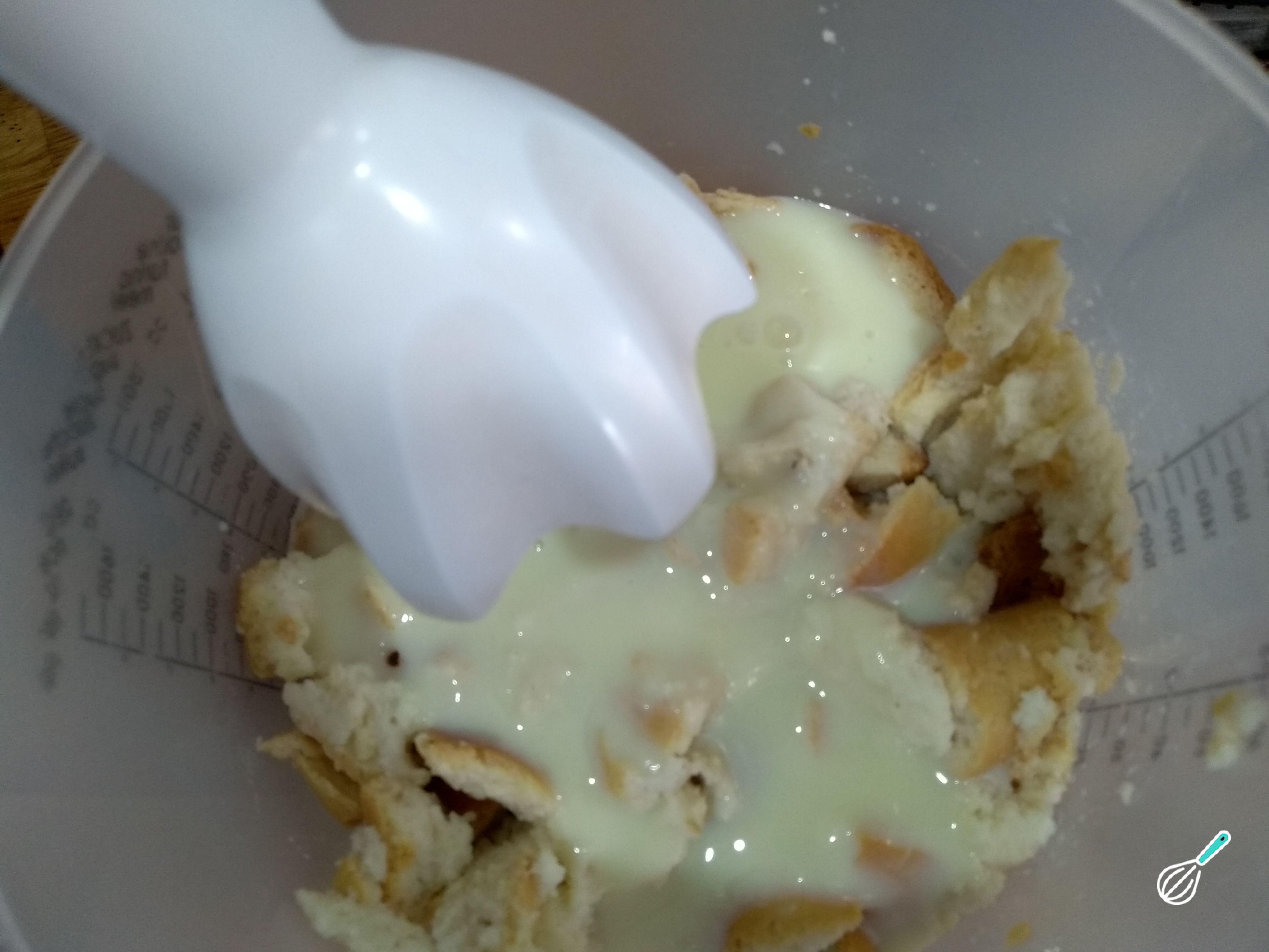 Em seguida bata o pão com o seu leite e o leite condensando no liquidificador ou com o mixer de mão até obter uma espécie de mingau.