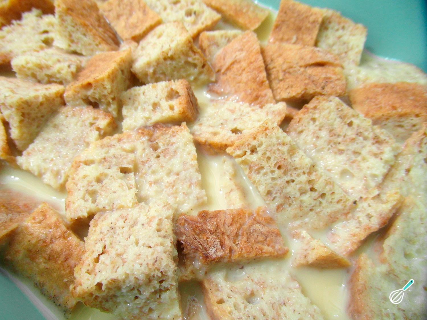 Para fazer essa receita de pudim de pão comece por cortar o pão em cubinhos e colocar em uma tigela. Acrescente o leite e leve ao microondas por 2-3 minutos, apenas para esquentar o leite e amaciar o pão mais rapidamente.