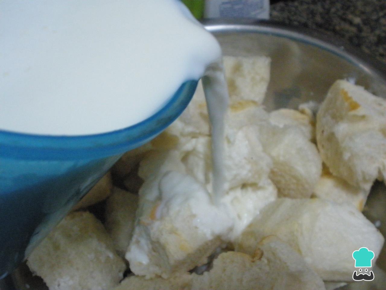 Preparar o pudim de pão velho é bem fácil! O primeiro passo é colocar numa vasilha grande os pães de molho no leite.