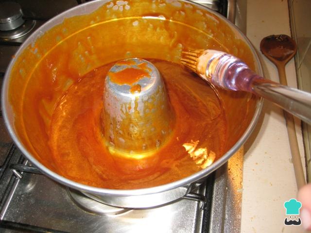O passo seguinte desta receita de pudim de pão amanhecido é preparar a calda: coloque o açúcar numa forma de pudim e leve ao fogo médio. Quando derreter e começar escurecendo, acrescente a água e deixe ferver até ficar no ponto de calda. Desligue o fogo e espalhe o caramelo por toda a forma.