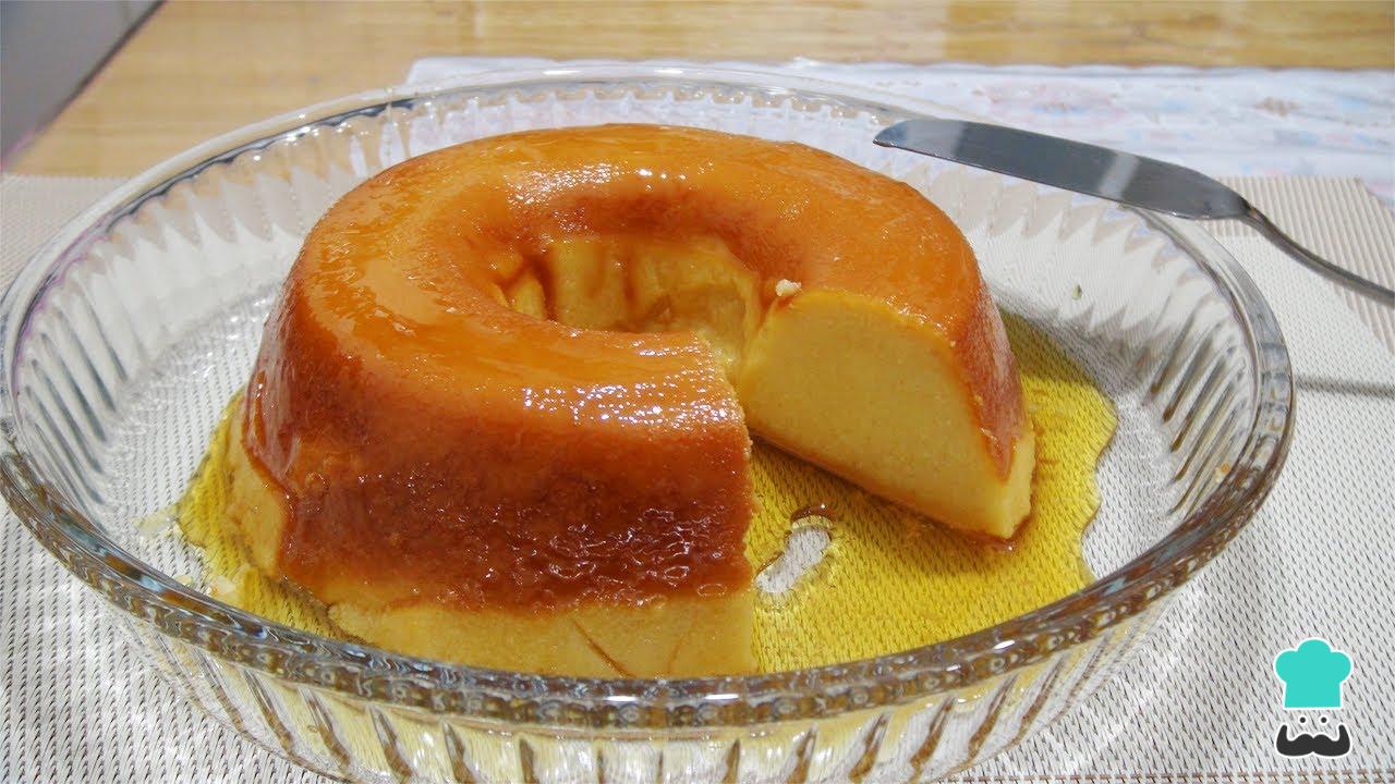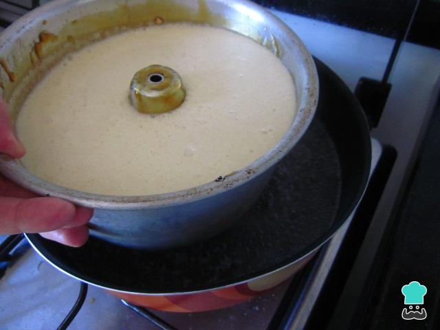 Transfira o preparado de pudim para essa forma e cozinhe, em banho maria, no forno preaquecido a 200ºC por 30-40 minutos, ou a parte de cima dourar.