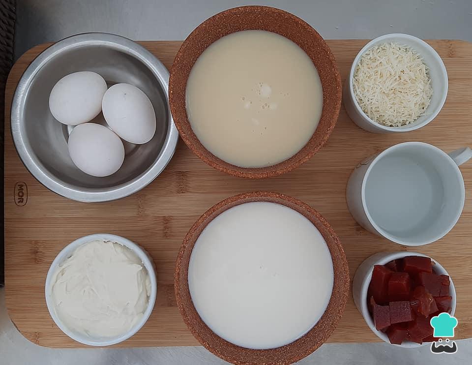 Separe os ingredientes necessários para preparar a receita de pudim de queijo com goiabada.