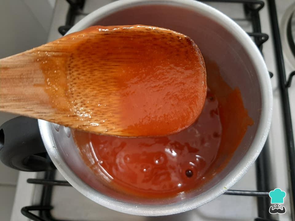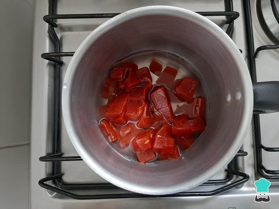 Para preparar a calda de goiabada, leve ao fogo baixo os pedacinhos de goiabada com a água, mexendo sempre até o doce ficar liso e cremoso.